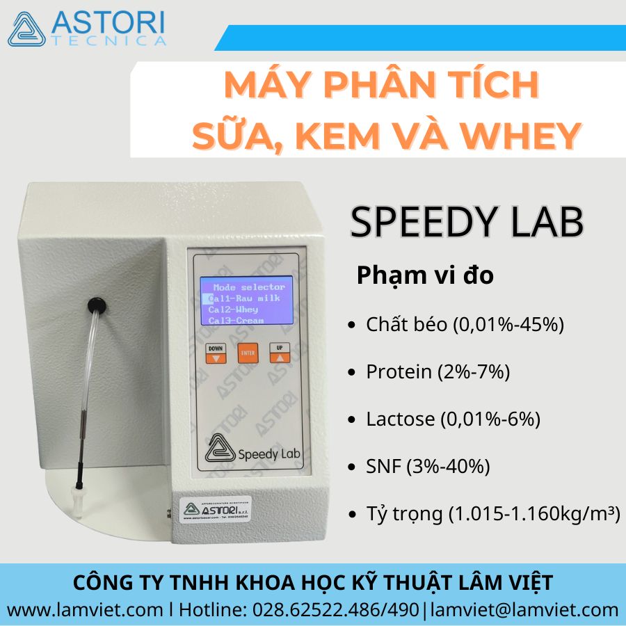 Speedy Lab là thiết bị phân tích nhanh các thành phần dinh dưỡng như chất béo, protein, lactose và chất khô không béo (SNF) trong sữa, kem và whey. Được sản xuất bởi ASTORI-ITALY, Speedy Lab sử dụng công nghệ siêu âm tiên tiến, không cần chuẩn bị mẫu, hóa chất hay vật tư tiêu hao, giúp tiết kiệm thời gian và chi phí đáng kể.