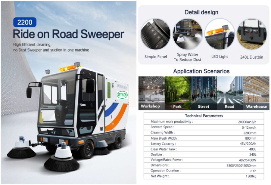 ARTISON 2200 là dòng máy quét rác tự hành cao cấp thuộc thế hệ mới, được thiết kế chuyên dụng cho nhà xưởng, công viên, đường phố, quốc lộ và kho bãi công nghiệp.