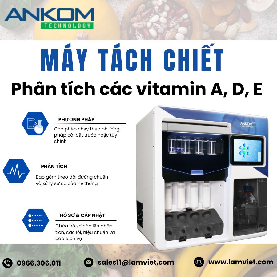 Máy phân tích vitamin A, D, E của hãng Ankom là một thiết bị được thiết kế để thực hiện các quy trình chiết xuất và phân tích các vitamin tan trong dầu như vitamin A, D, E từ các mẫu thực phẩm, thức ăn chăn nuôi, và các sản phẩm sinh học khác. Các thiết bị này thường được sử dụng trong các phòng thí nghiệm nghiên cứu, kiểm nghiệm chất lượng, và trong ngành công nghiệp thực phẩm và dược phẩm.