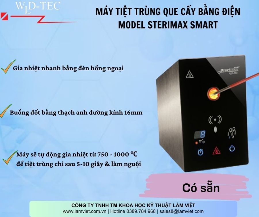 - Máy tiệt trùng que cấy WLD Sterimax Smart là thiết bị tiệt trùng bằng điện, lý tưởng cho các phòng thí nghiệm, tủ an toàn sinh học và những khu vực không cho phép có ngọn lửa trong quá trình vận hành. Với thiết kế hiện đại và tính năng tự động, Sterimax Smart mang đến sự an toàn và hiệu quả cao trong việc tiệt trùng dụng cụ thí nghiệm.