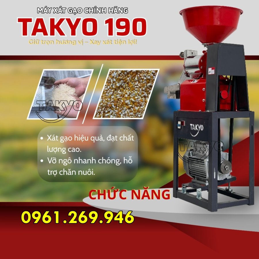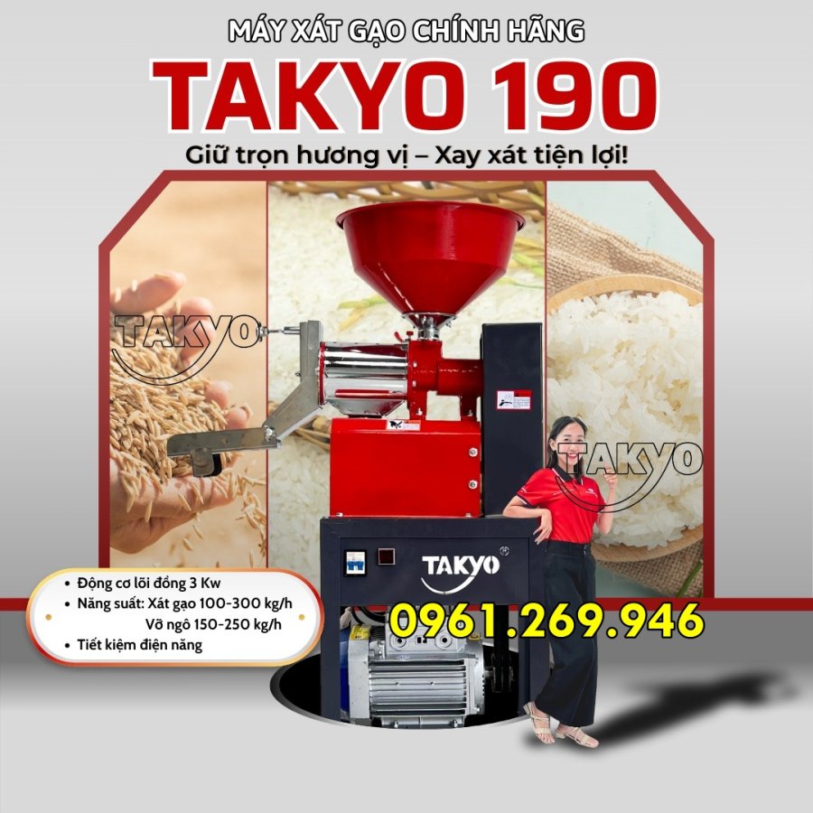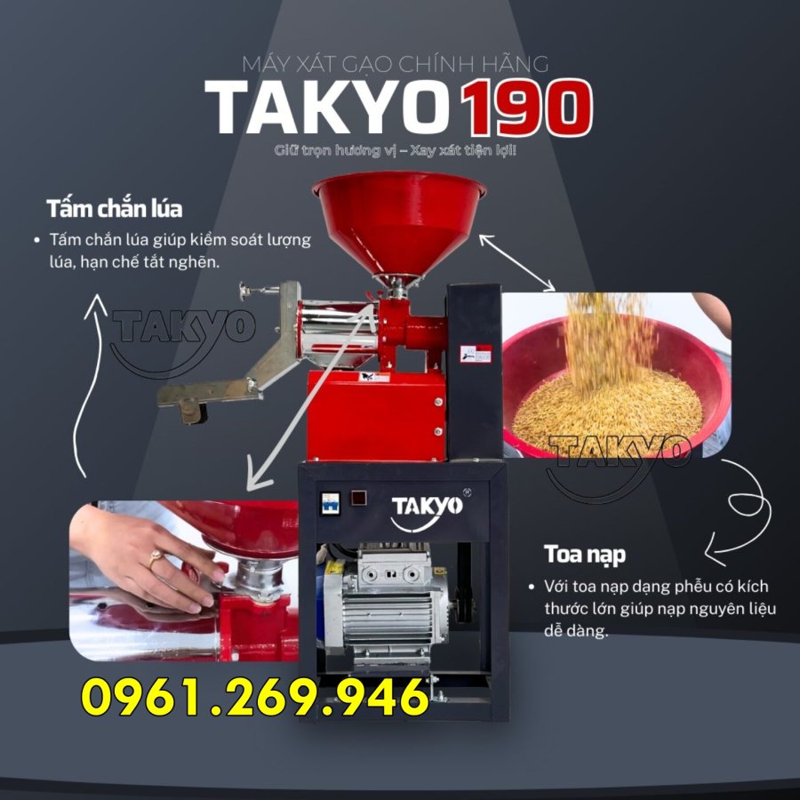 Máy xay xát gạo Takyo TK190 là dòng máy mini chuyên dùng trong gia đình. Máy sử dụng điện 220V dân dụng, dễ dàng lắp đặt và vận hành, phù hợp với mọi không gian bếp hoặc khu vực sản xuất nhỏ. Với cơ chế vận hành mạnh mẽ và khả năng xử lý hạt gạo nhanh chóng, máy giúp người dùng chủ động xay gạo sạch ngay tại nhà mà không cần ra tiệm.