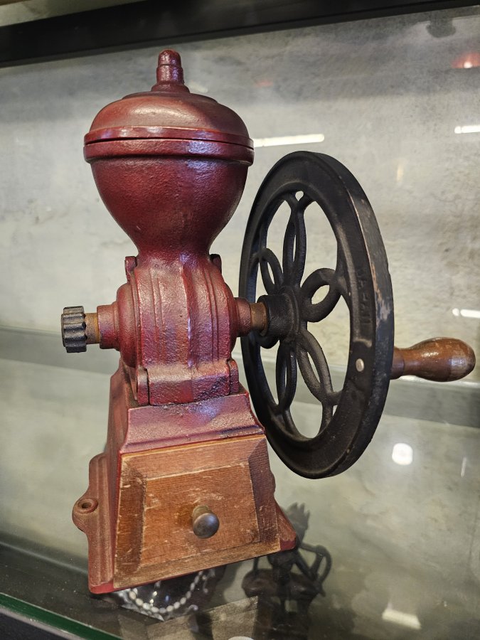 Máy xay café bằng kim loại, trưng bày đẹp.