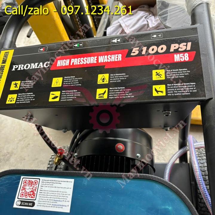 - Promac M58 là dòng máy rửa xe chuyên nghiệp chuyên dùng để xịt rửa xe cho các gara ô tô, rửa xe công trường, vệ sinh xưởng sản xuất...