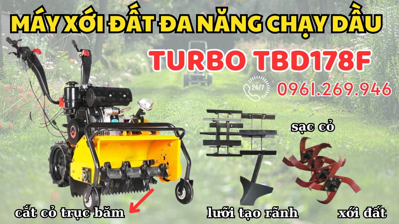 Chức năng đa năng: Máy có khả năng xới đất, làm tơi đất, băm nhỏ cỏ, rơm rạ và thậm chí có thể gắn thêm phụ kiện để làm các nhiệm vụ khác như cày bừa, lên luống, trồng cây.
