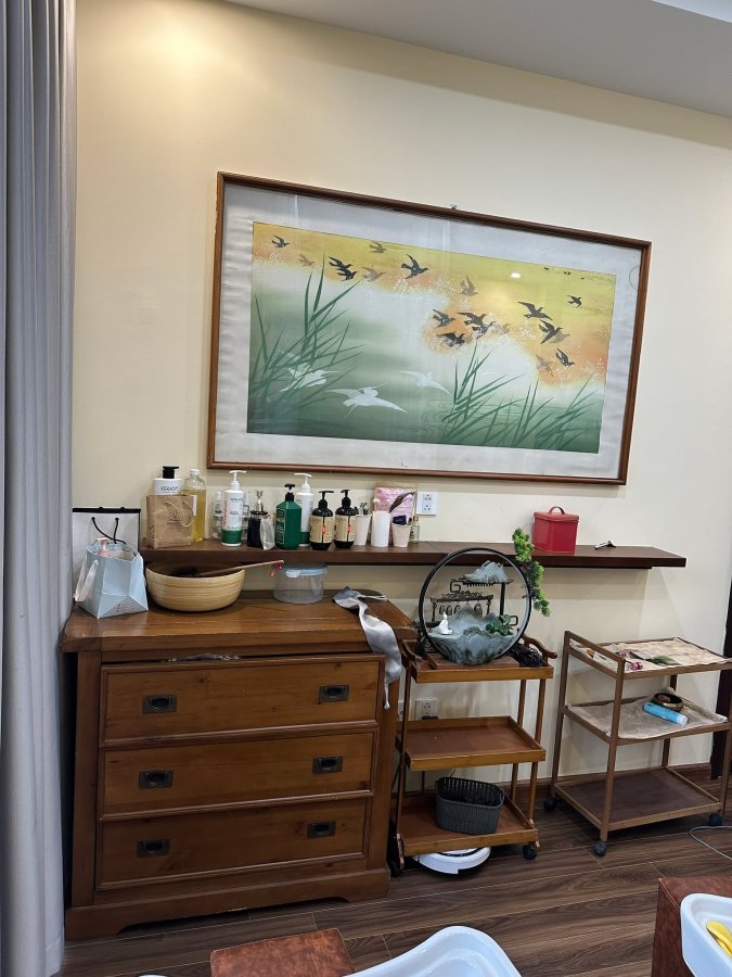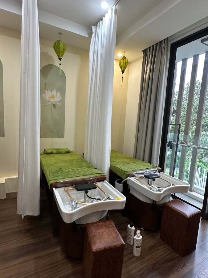 - 2 giường gội dưỡng sinh có vòm xả tia nước + 2 ghế cho kĩ thuật viên. Gỗ chắc chắn, 10 người đứng lên ok, phần dưới để đồ của khách và đứng chân lên được