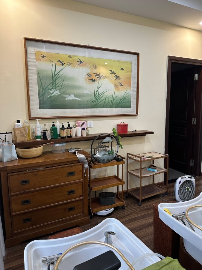 - 2 giường gội dưỡng sinh có vòm xả tia nước + 2 ghế cho kĩ thuật viên. Gỗ chắc chắn, 10 người đứng lên ok, phần dưới để đồ của khách và đứng chân lên được