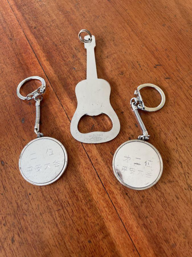 Bán 3 móc khóa rất đẹp. 2 cái tròn mặt bạc, khui bia Ideal D.patent thép trắng