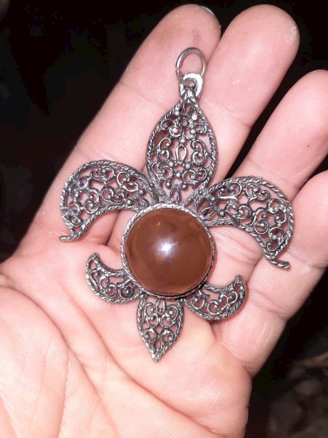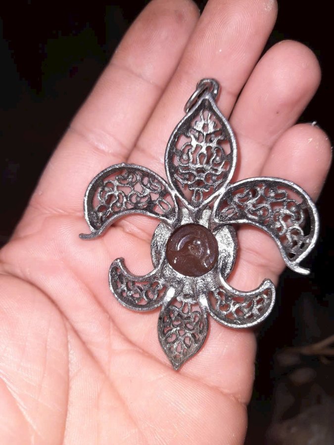 Móc khóa kim loại hoa văn đẹp. Hạt chủ nhựa giả đá. Phong cách vintage. Có thể dùng làm mặt dây chuyền hoặc đuôi chuông gió.