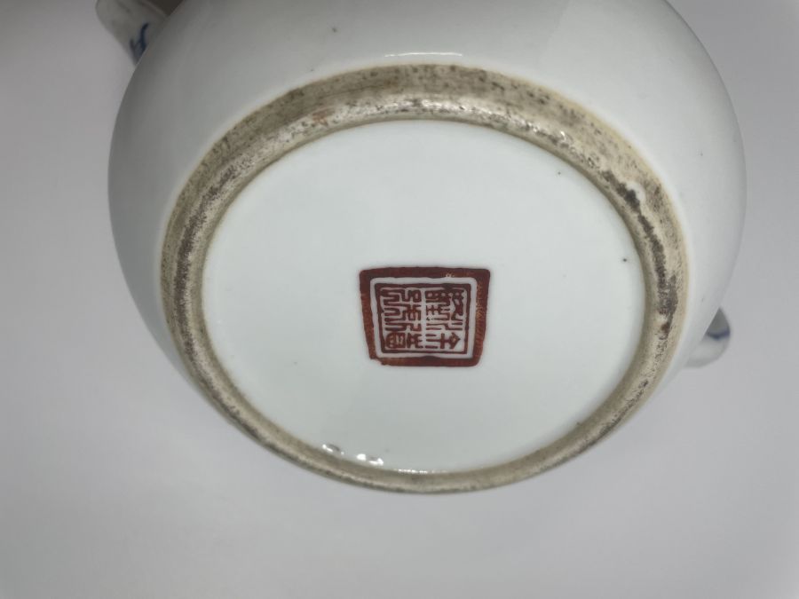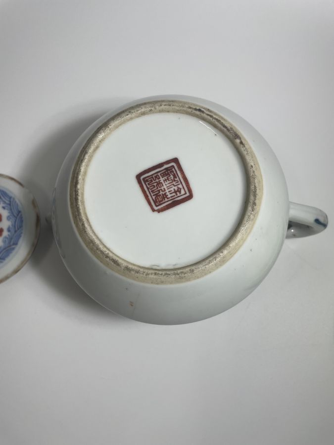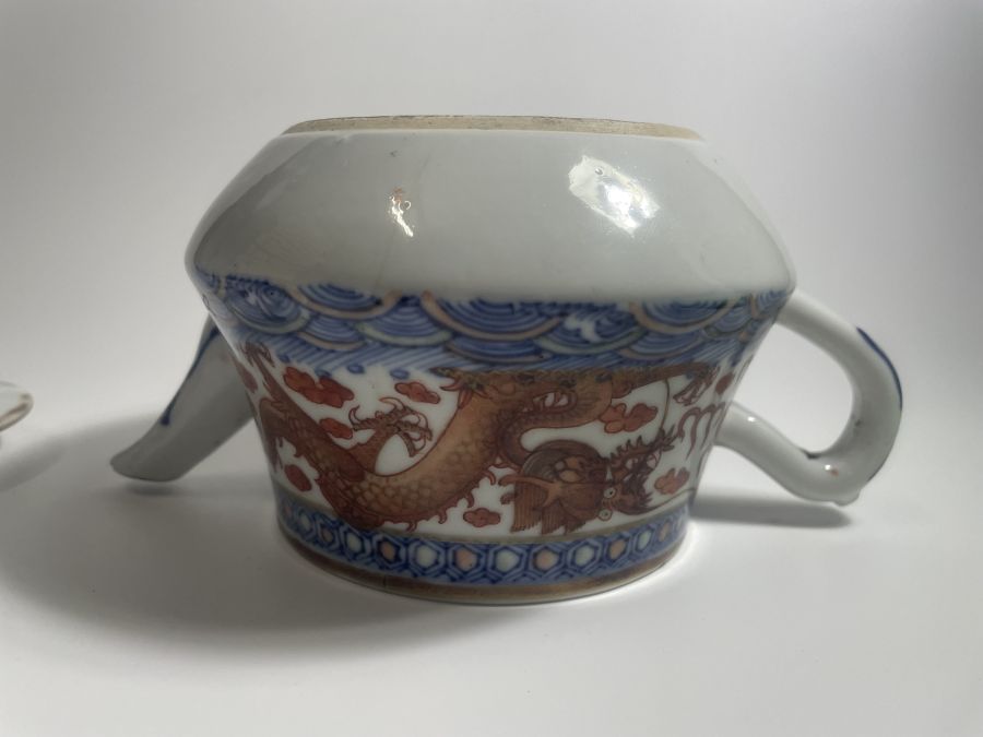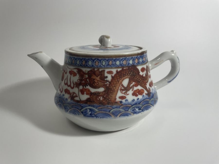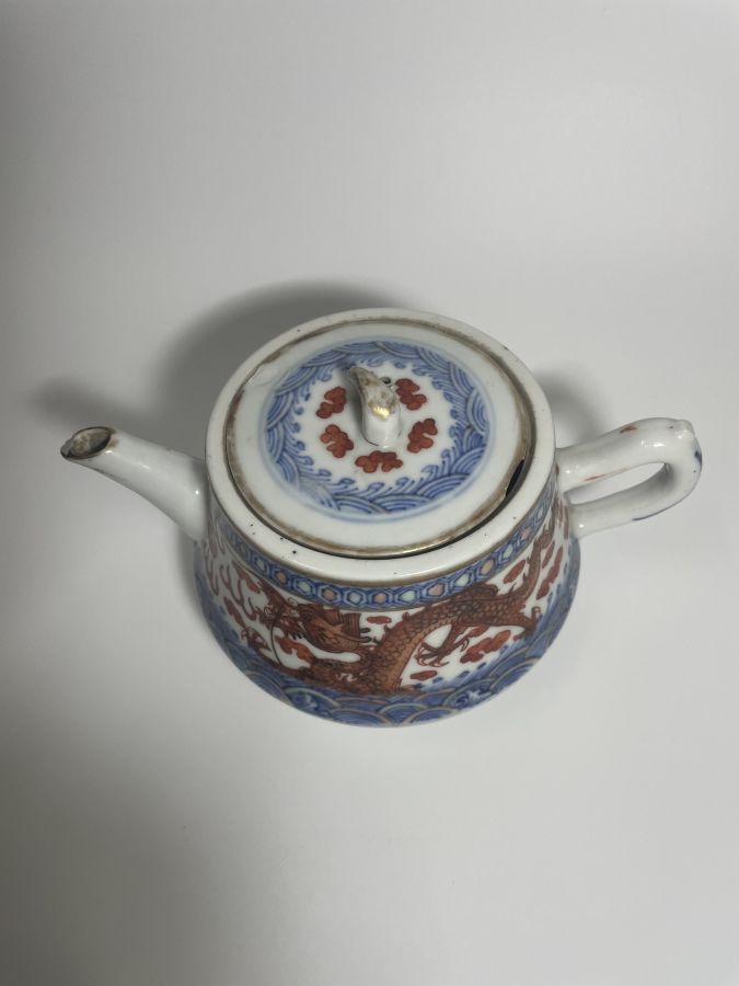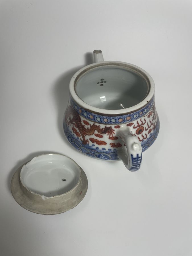 Ấm chàm men lạc tinh, già đồ vẽ Rồng Đạp Sóng Thuỷ Ba, chàm mực socola,mộc triện đỏ,quai lòng chữ Thọ. Nắp quai đắp nổi nhành đào độc đáo.