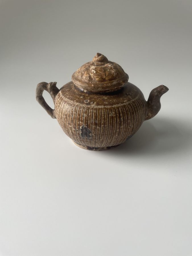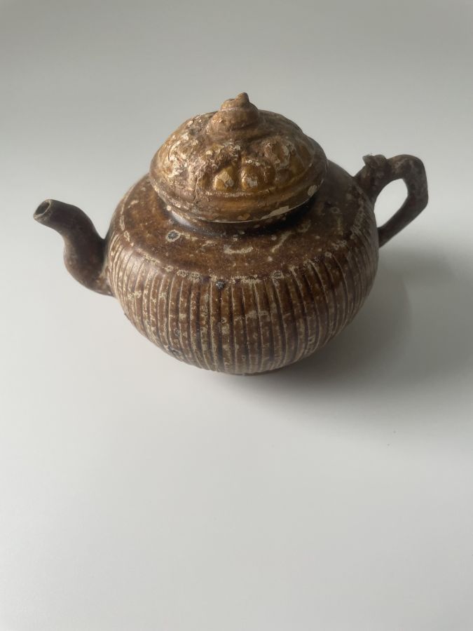 Ấm trà quai mắc trúc ám họa, men hoàng niên đại Lê Mạc, cốt khô già.