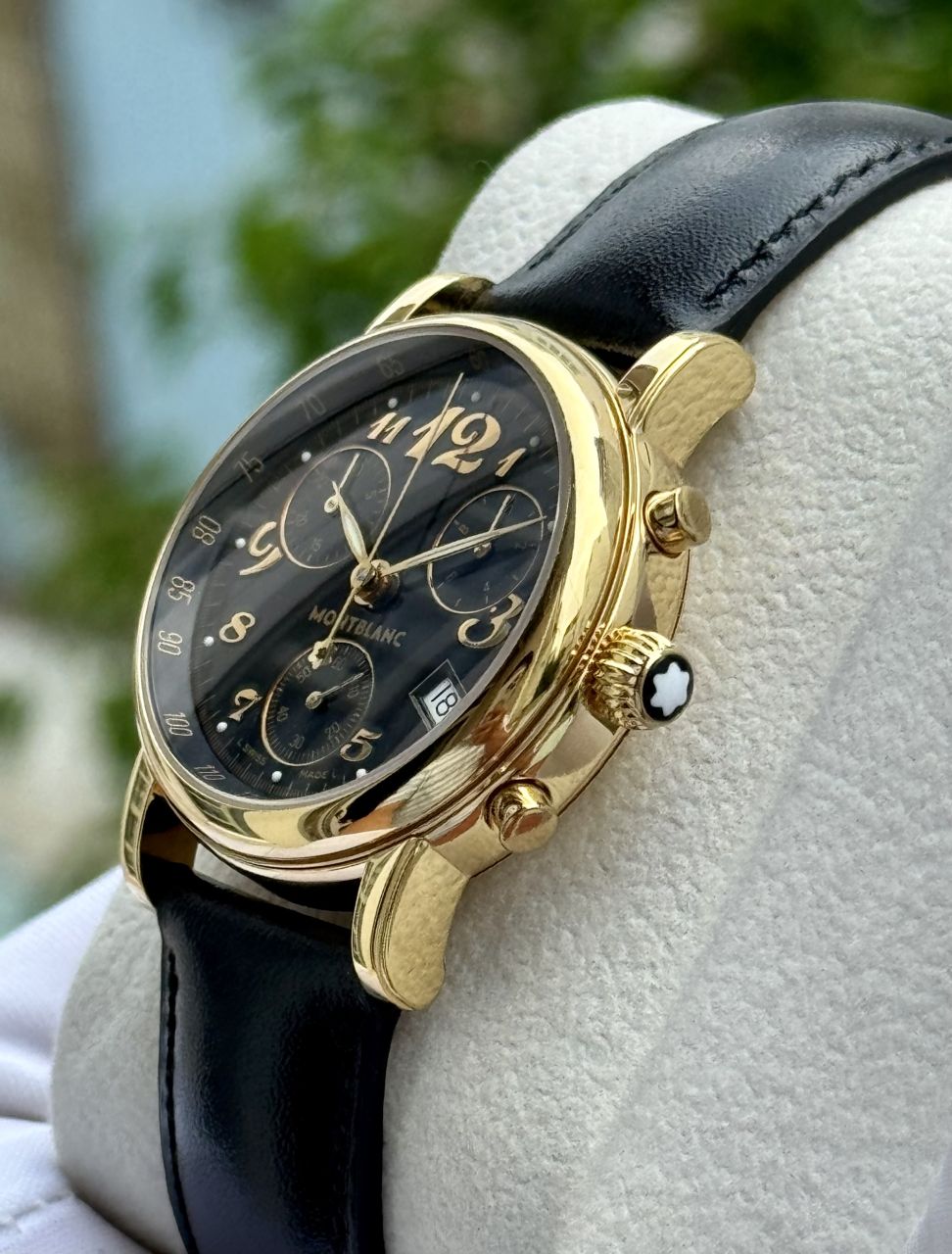 Chiếc đồng hồ Montblanc Meisterstück Chronograph size 36mm, Placque vàng sang trọng, mặt đen huyền bí cùng bộ số Ả Rập cổ điển. Thiết kế 3 sub-dial chức năng chronograph, ô lịch ngày góc 4h tinh tế – tất cả tạo nên một tổng thể đậm chất quý ông thành đạt.