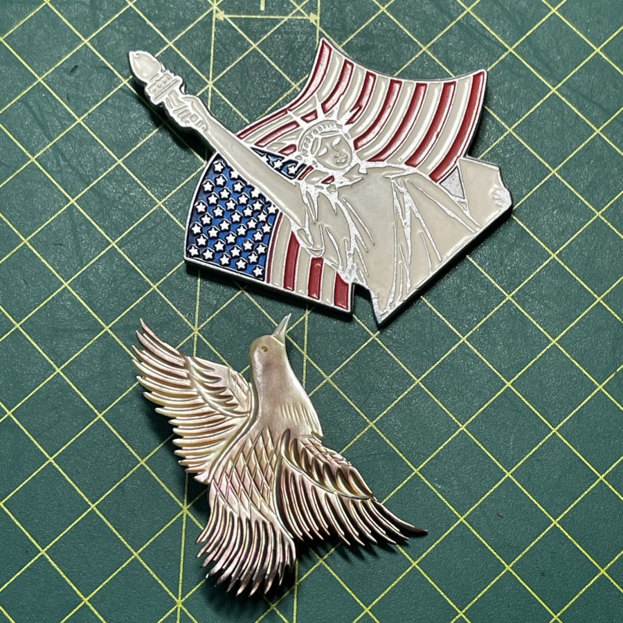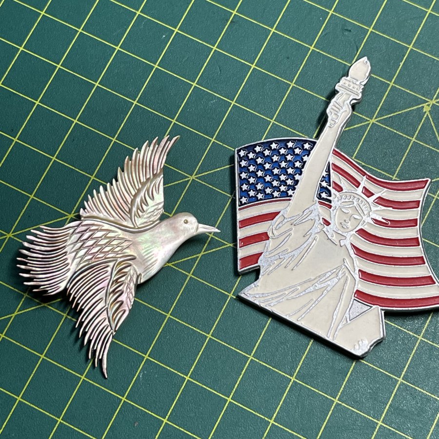 Một bộ Cài áo ngoại xưa Nước Trump chính hãng - Chất liệu nữ thần tự do bằng hợp kim khảm men - Đại bàng bằng xà cừ chạm tay - tình trạng đẹp - giá 299k ( KMC ). Kính mời