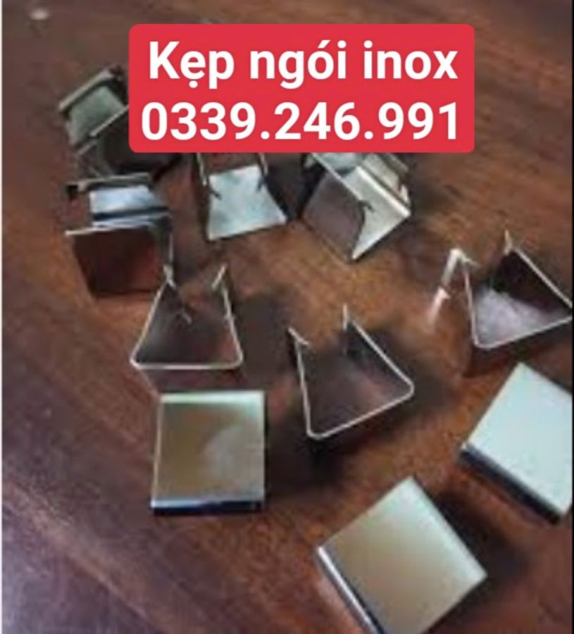 - Kẹp ngói nóc inox - Kẹp ngói rìa inox không gỉ, dùng kẹp vào đầu 1 viên ngói nóc giúp viên ngói chặt hơn. Giúp cho ngói không bị bung ra bởi sức giật của gió bão, rút ngắn thời gian thi công.