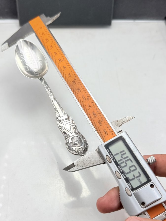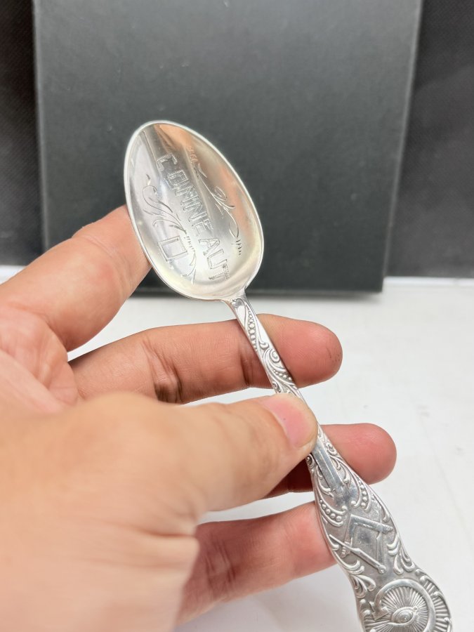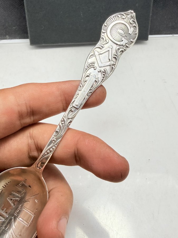 Muỗng Masonic bạc xưa... Kích thước: 14.7x 3.1cm.