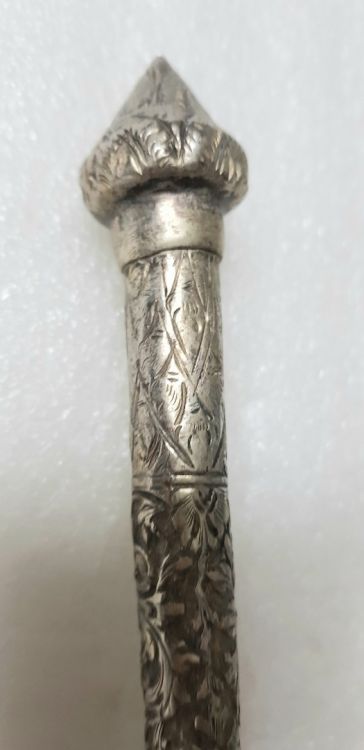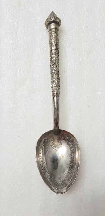 Cai muỗng xưa bằng đồng bọc bạc, cầm nặng tay, hoa văn rất đẹp, dài 25 cm. Cảm ơn các bạn đã xem tin
