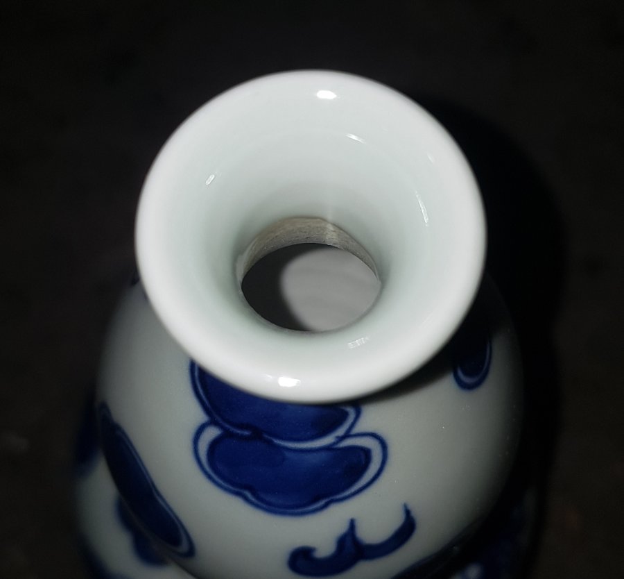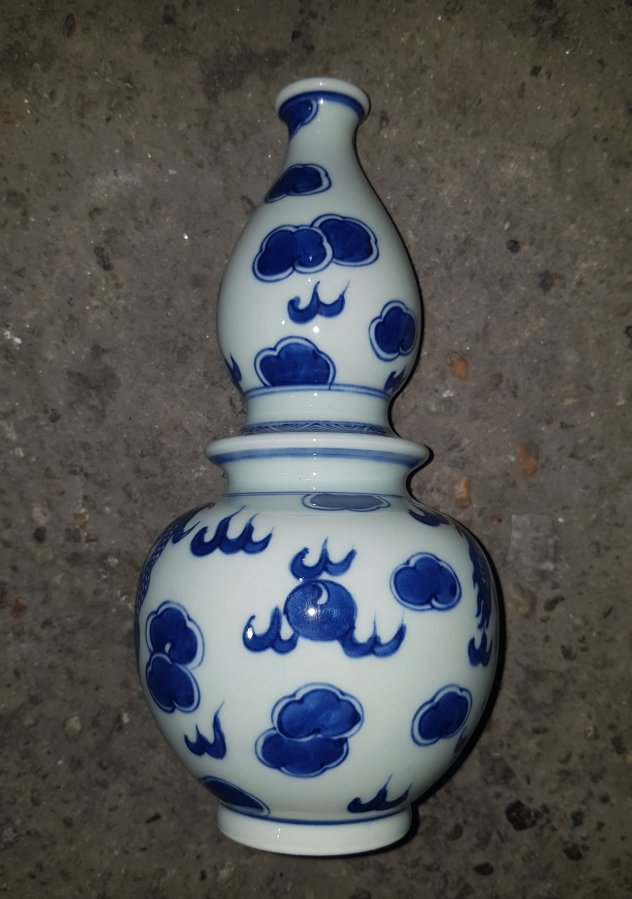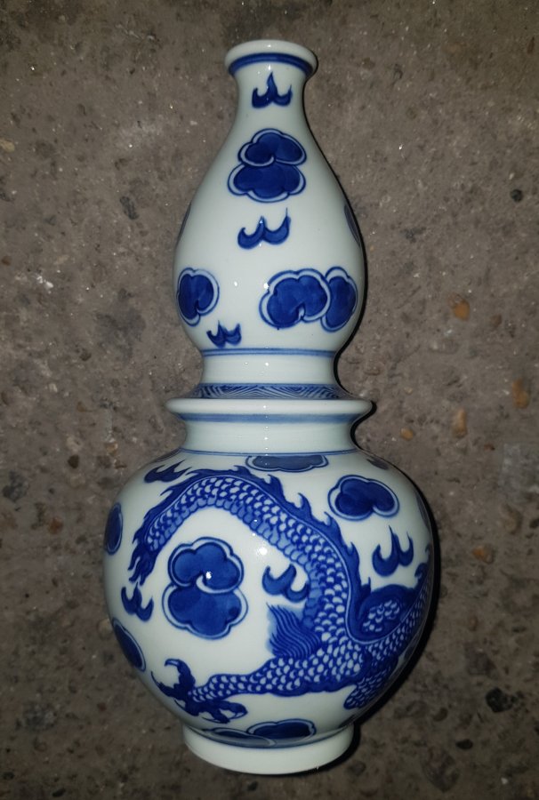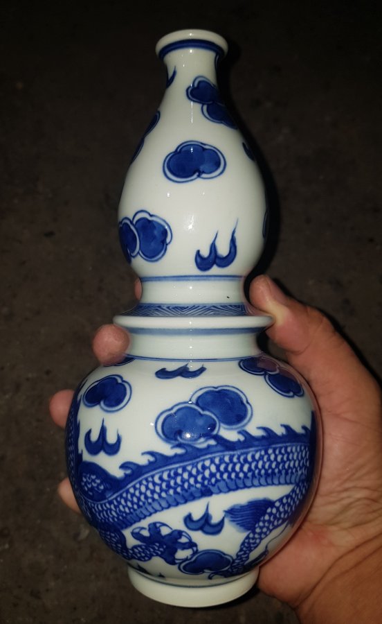 Nậm 2 bầu họa pháp long vân với dáng hiếm thấy bởi sự sáng tạo trong cách tạo hình. Men lam chàm hồi cao lanh tinh anh. cao tổng thể 21cm. vòng bụng 33cm. GL1250k