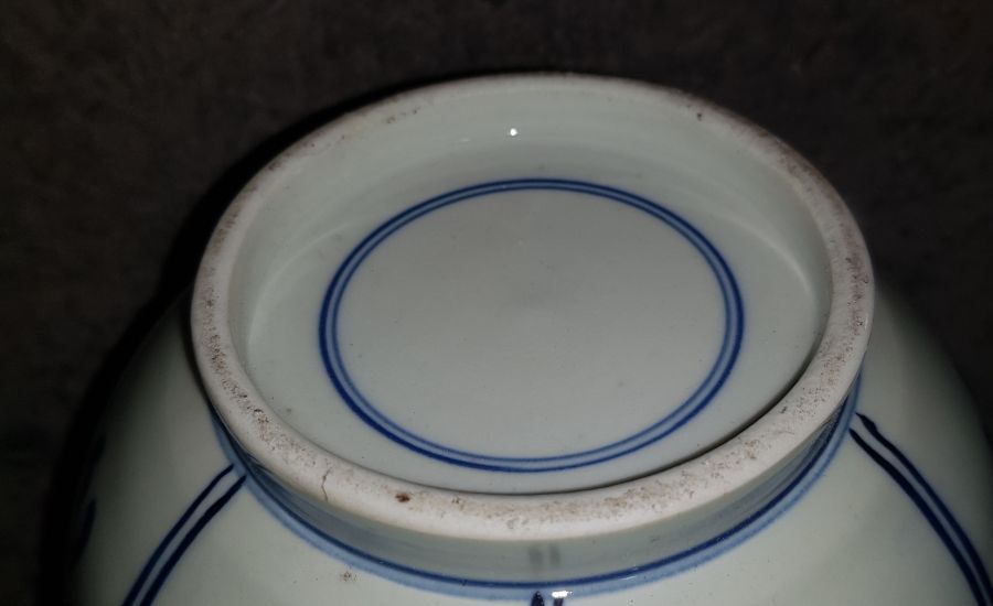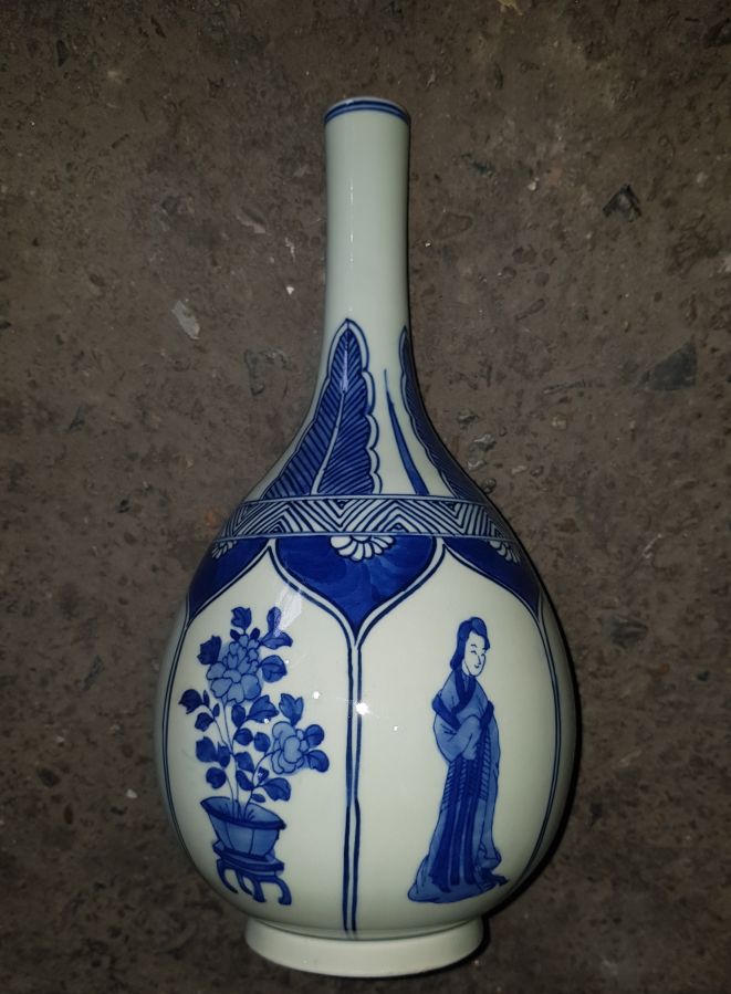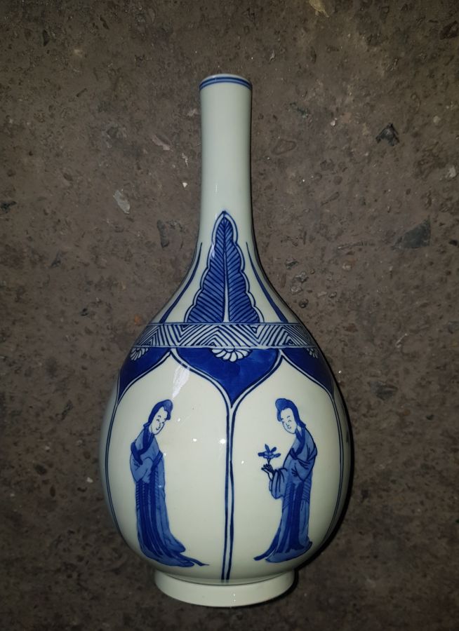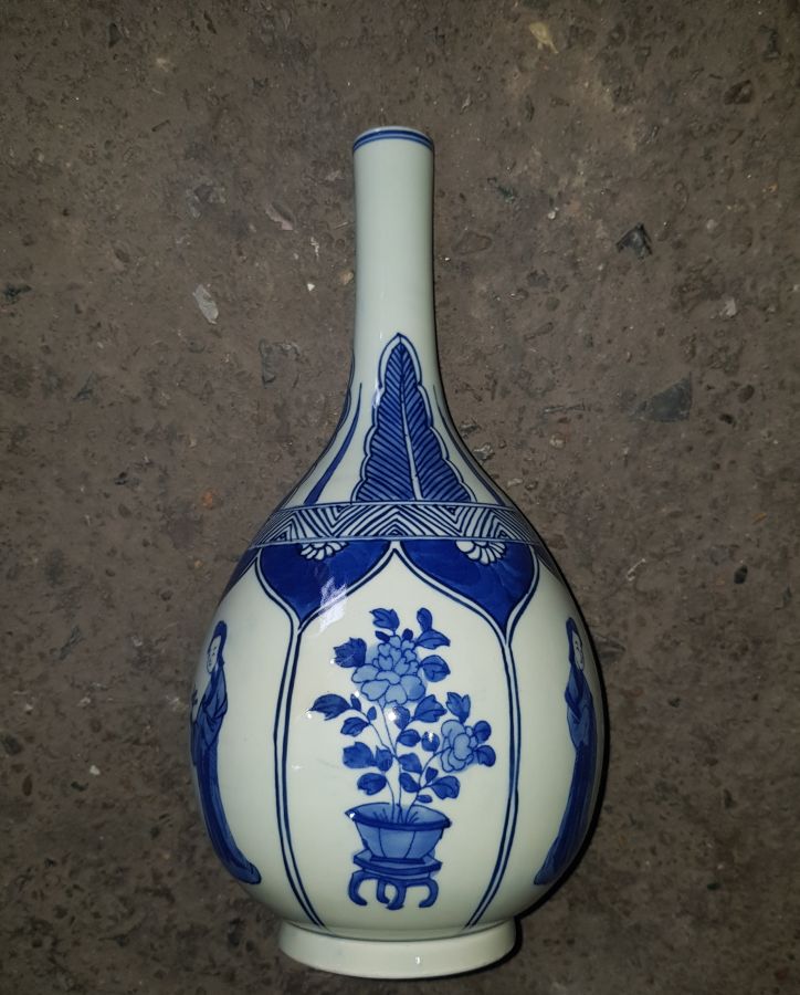Nậm sứ men lam chàm hồi bổ ô vẽ người cảnh sen kẽ. Nậm khá lớn với chiều cao 27.5cm. vòng bụng 43.5cm. lành lặn GL1950k