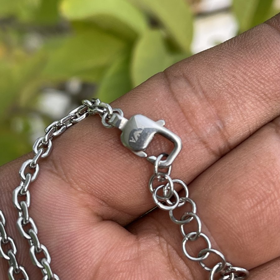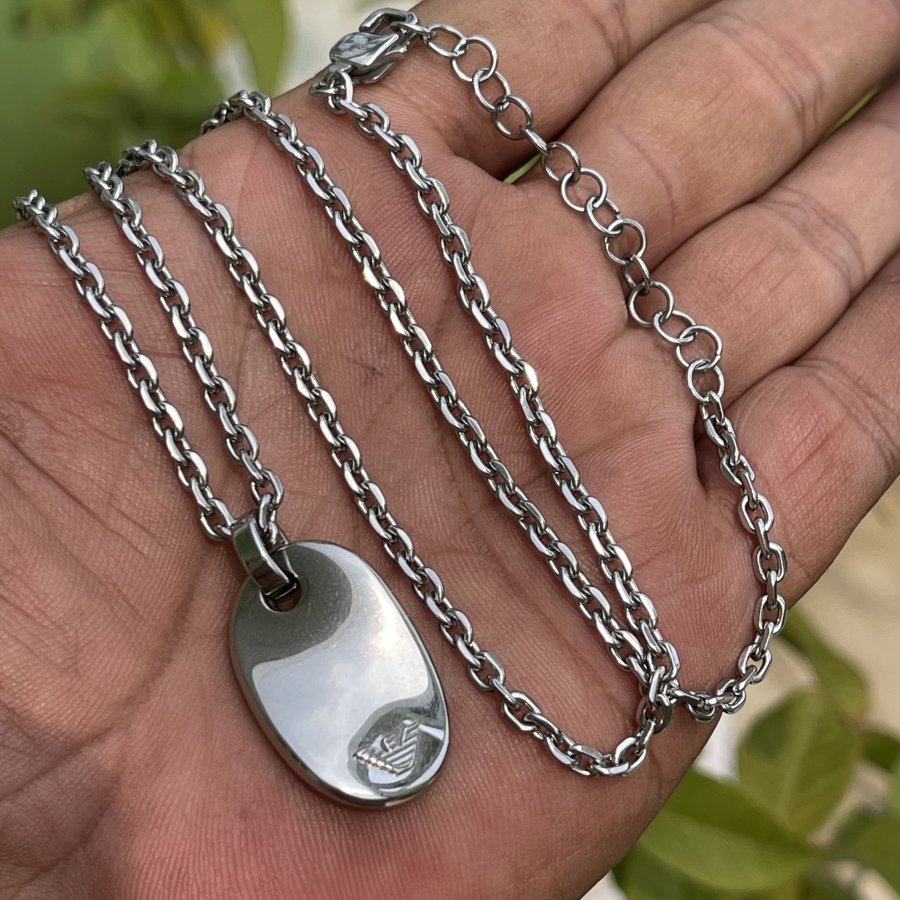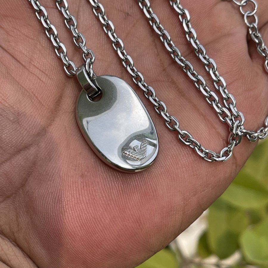 Nguyên comple hàng hiệu Armani chính hãng nguyên zin 100% - chất liệu thép vĩnh cửu - dây dài 55cm ( Đeo dạng vừa không tròng đầu - mặt dây trắng cà xám đen lật được 2 mặt ) - giá hãng trên 4 triệu - em bán 499k ( KMC ). Kính mời