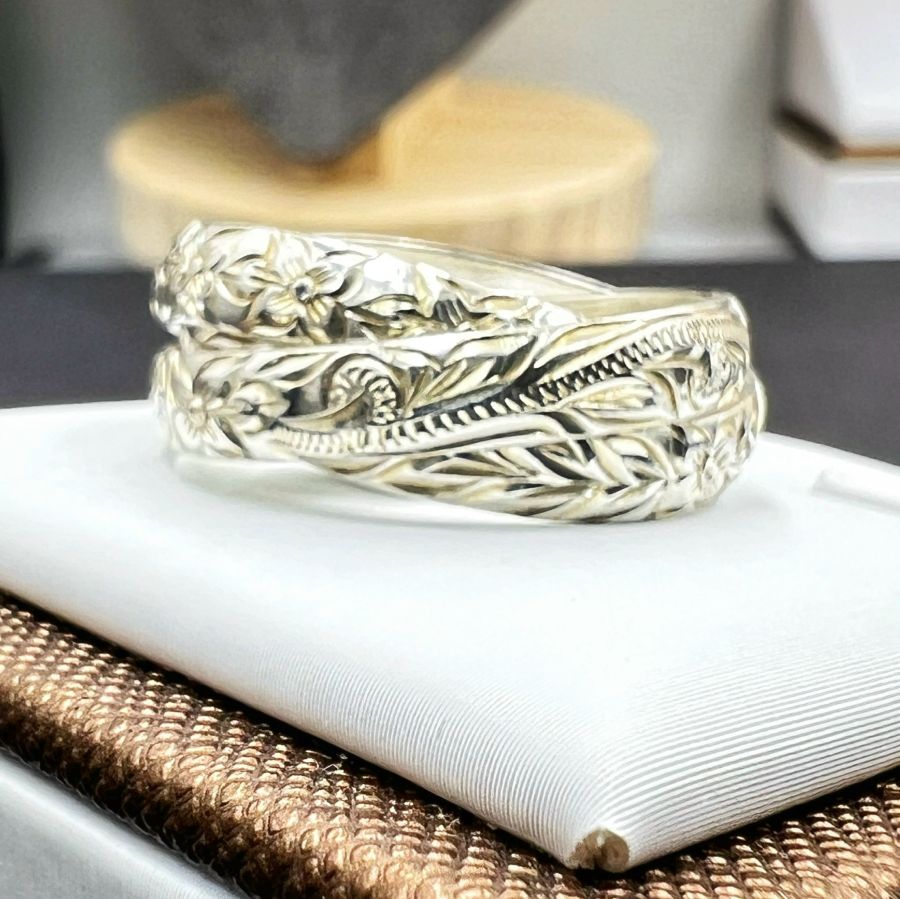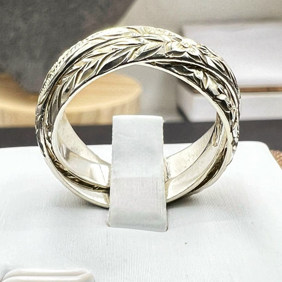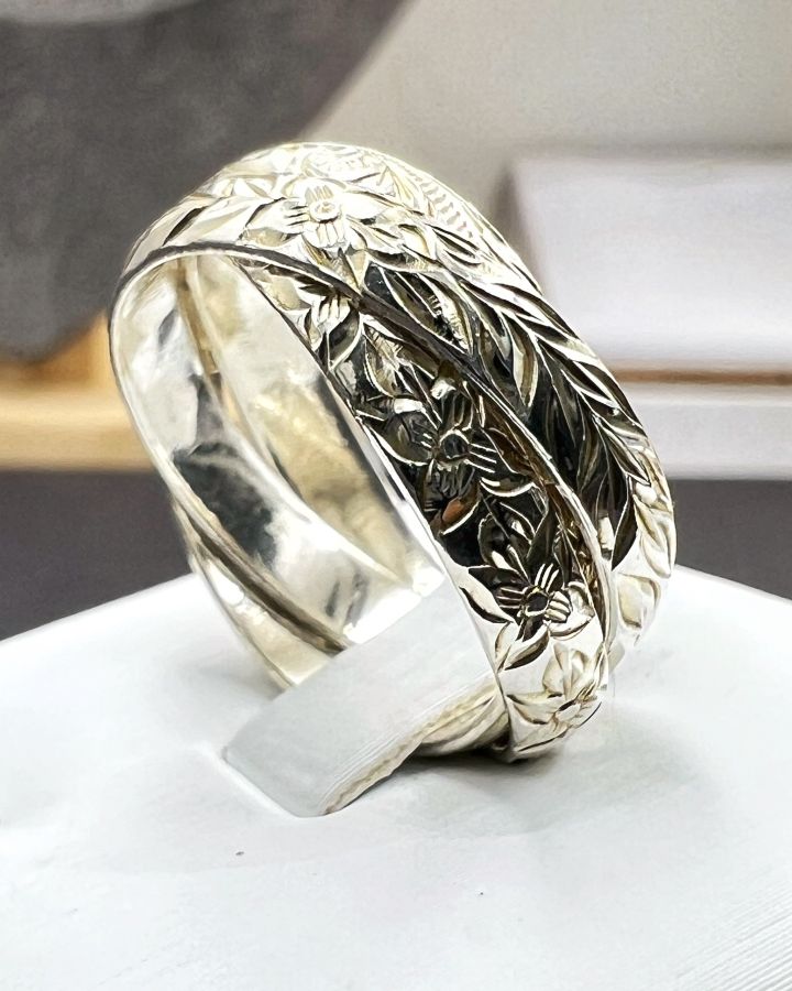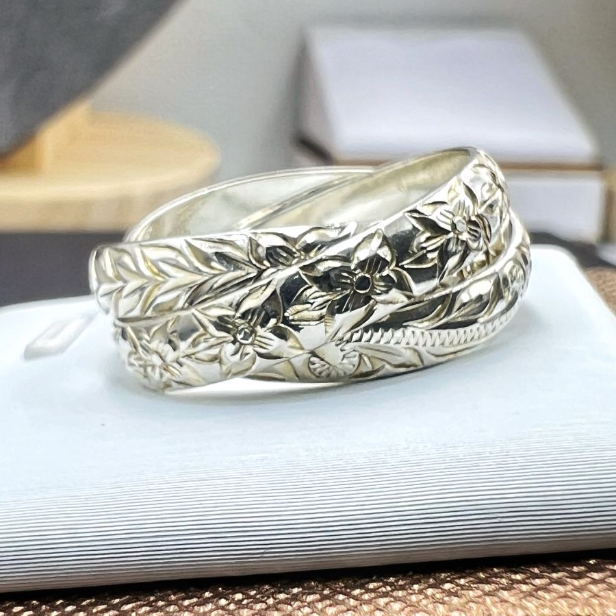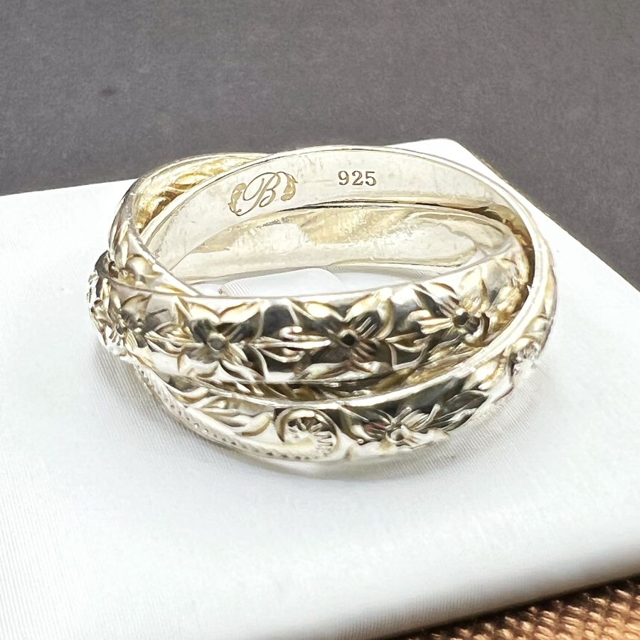 Nhẫn 3 chiếc *****g vào nhau bạc 925 Nhật hiệu Bless mới tinh hoa văn sắc nét rất đẹp, phôm bự, size 19mm - bản ngang 8mm, nặng 7.2gram (1.92 chỉ)