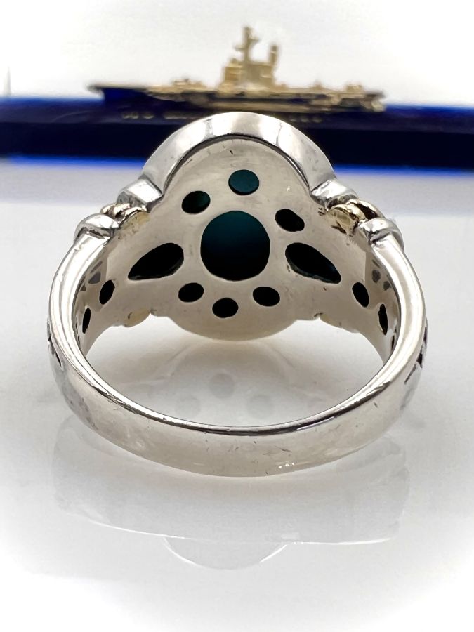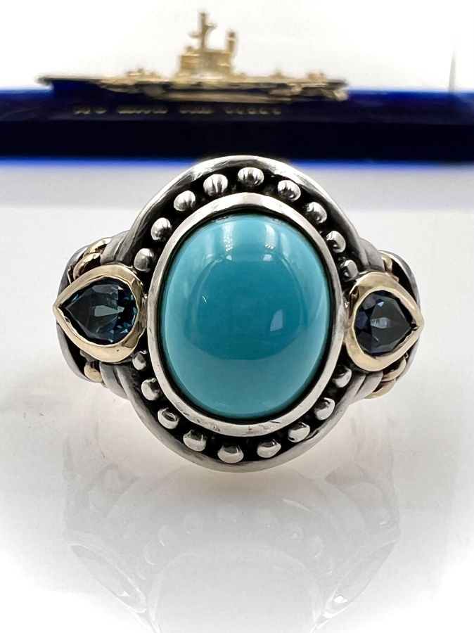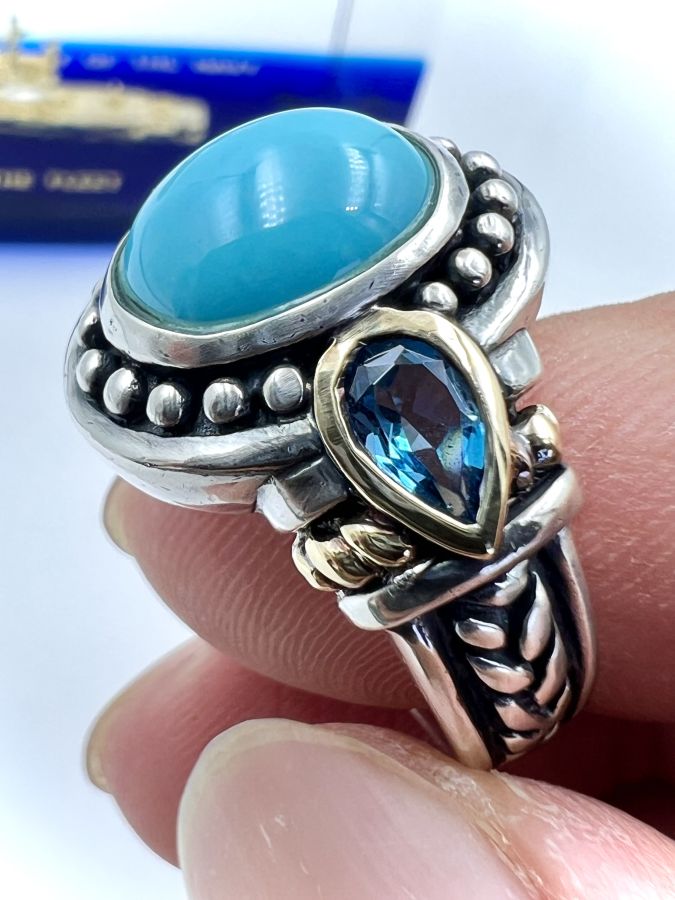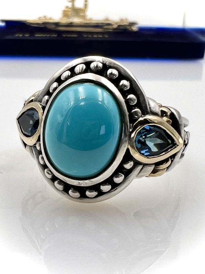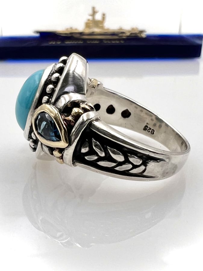 Nhẫn bạc 925 đemi vàng 18k hiệu BJC Samuel Bemham mới tinh hoa văn sắc nét đính đá ngọc lam và 2v đá topaz rất đẹp, size 18.5mm - bản ngang 18mm, nặng 9.2gram (2.45 chỉ) Thiên 0923.12.6789