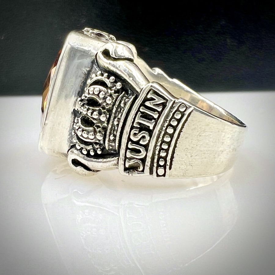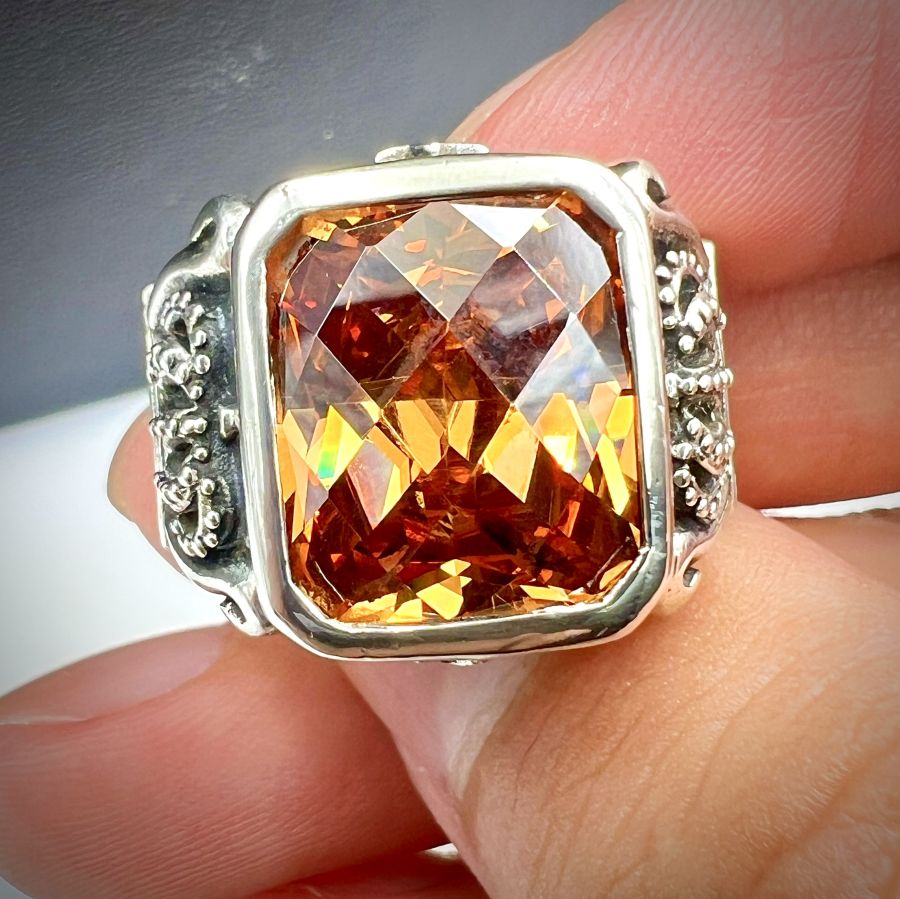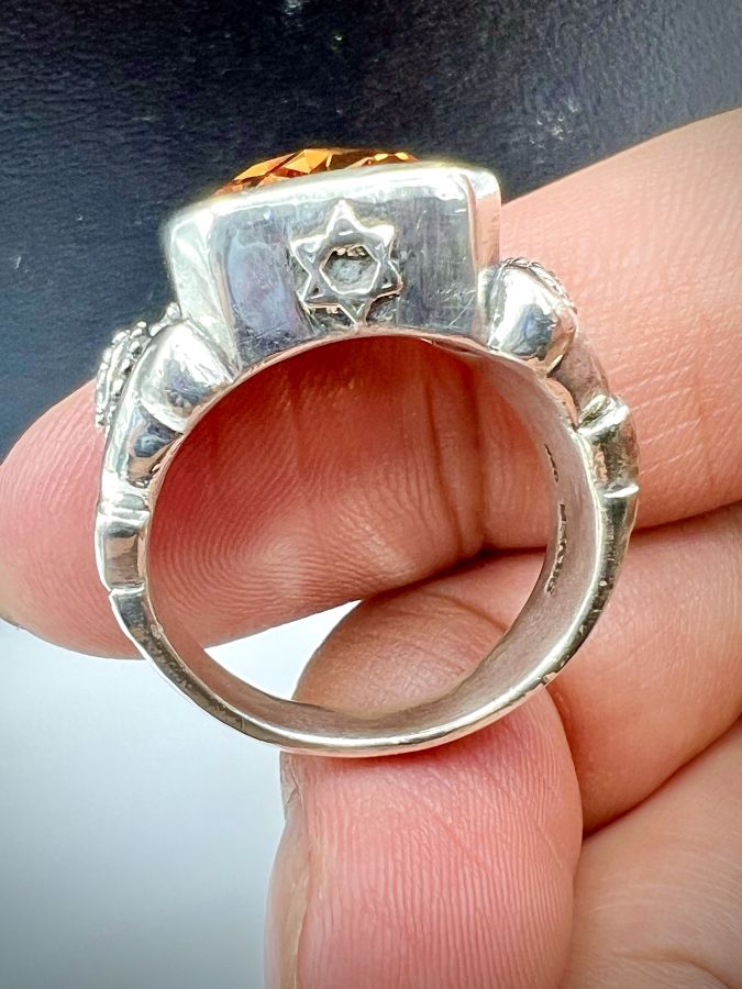 Nhẫn bạc 925 hiệu Justin davis hoa văn sắc nét đính đá vàng hổ phách đa giác rất đẹp, size 20mm - bản ngang 18mm, nặng 21.23gram (5.66 chỉ) Thiên 0923.12.6789