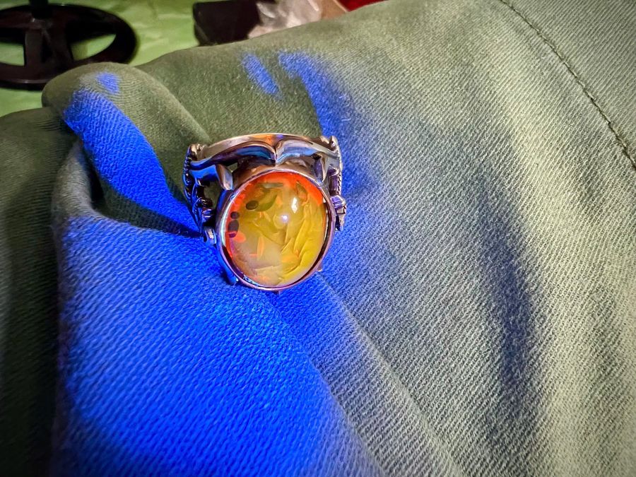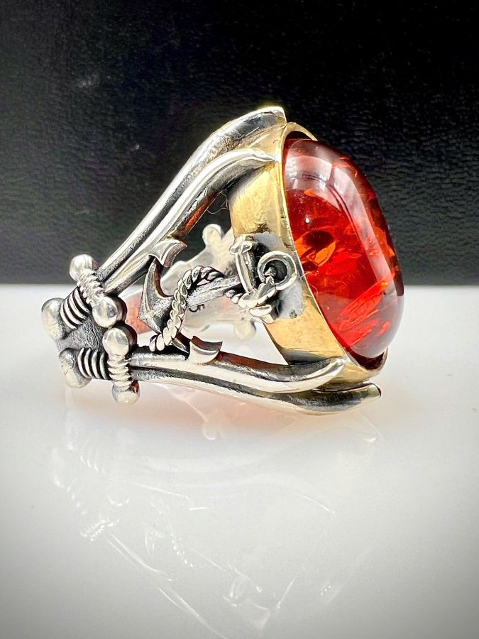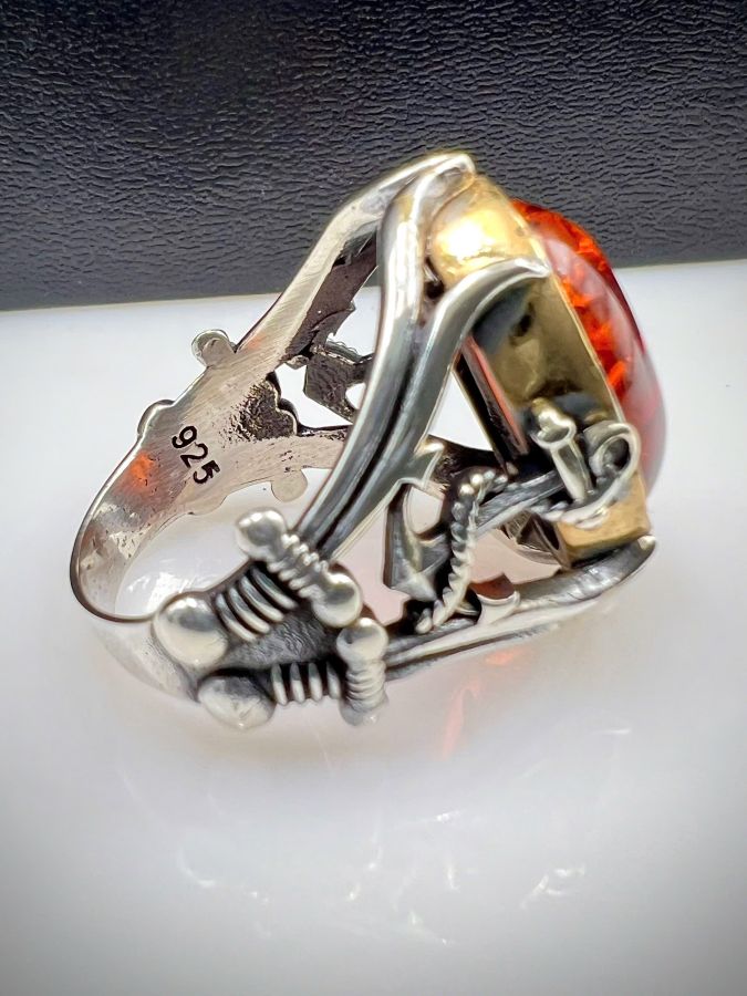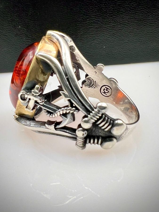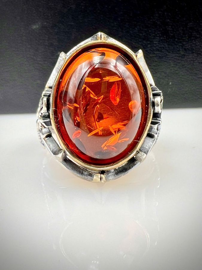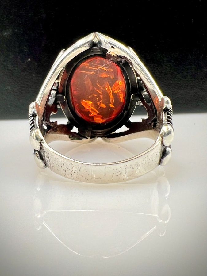 Nhẫn bạc 925 hiệu KGH hoa văn sắc nét đính viên hổ phách huyết nở hoa rất đẹp, size 21.5mm, nặng 13.8gram (3.68 chỉ)