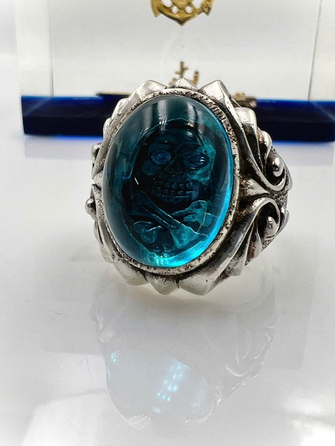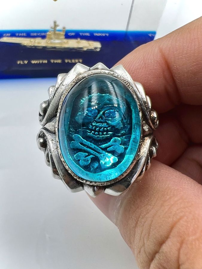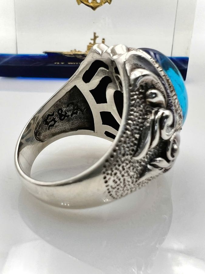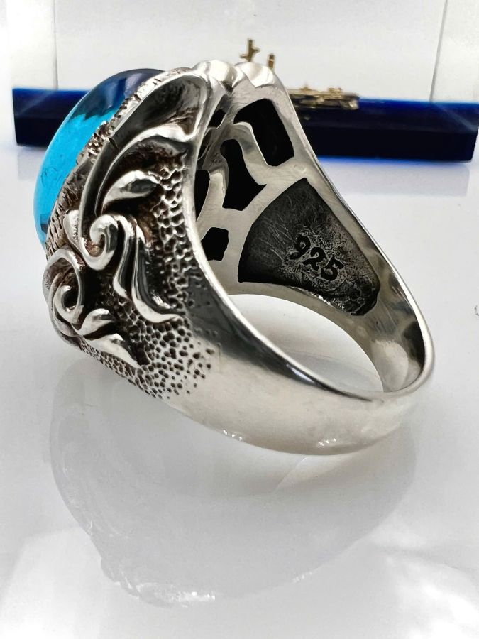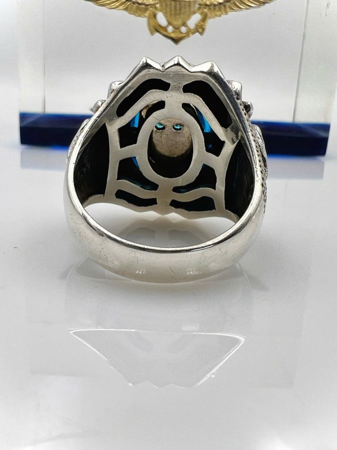 Nhẫn bạc 925 hiệu S&A hoa văn sắc nét đá topaz xanh có logo rất đẹp, Size 22mm - ngang 27mm, nặng 22.68gram (6.05 chỉ)