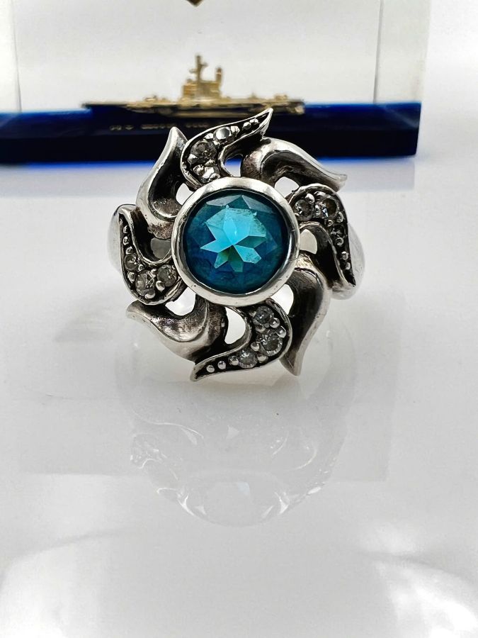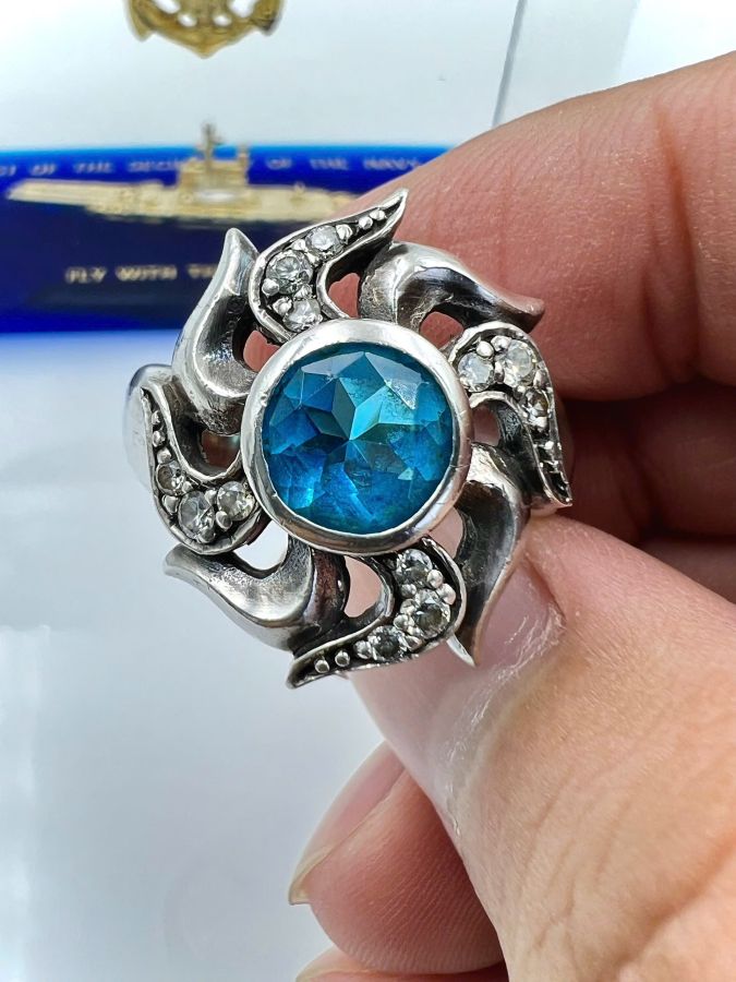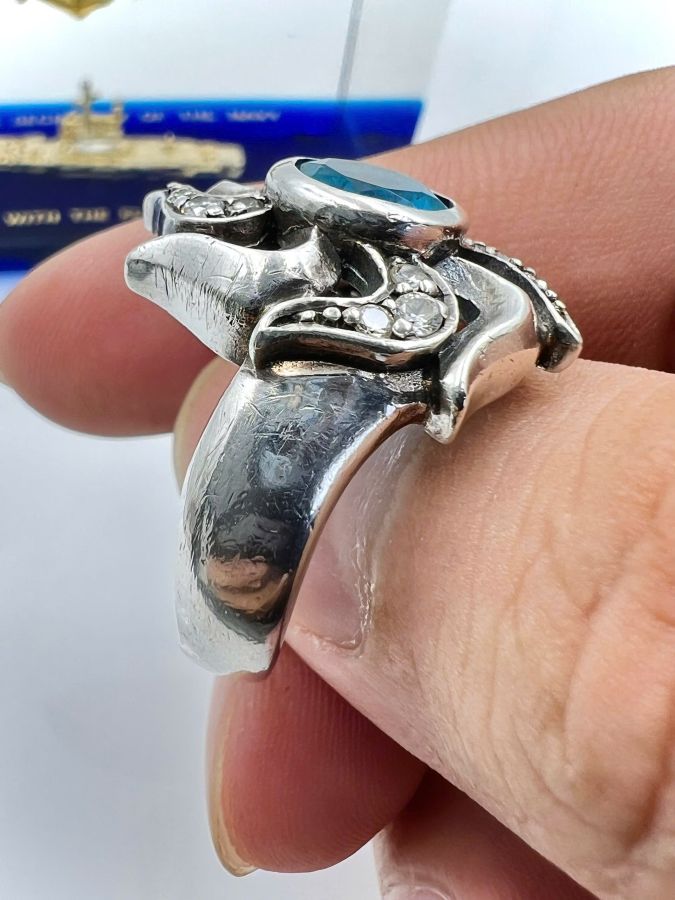 Nhẫn bạc 925 hiệu S&A hoa văn sắc nét đính full soàn Cz và đá topaz xanh đa giác rất đẹp, Size 20mm - ngang 24mm, nặng 11.78gram (3.14 chỉ)