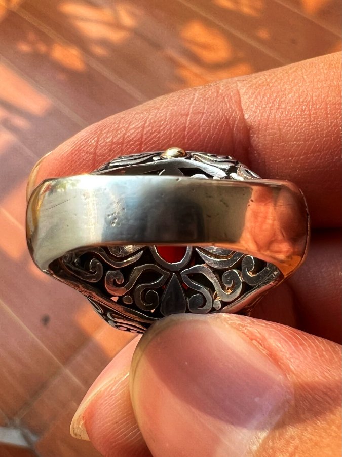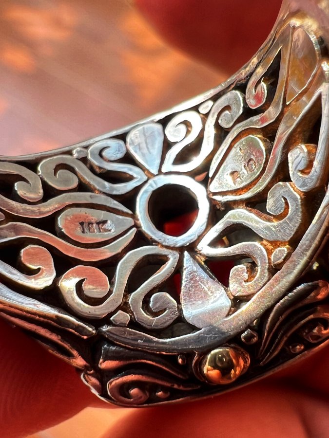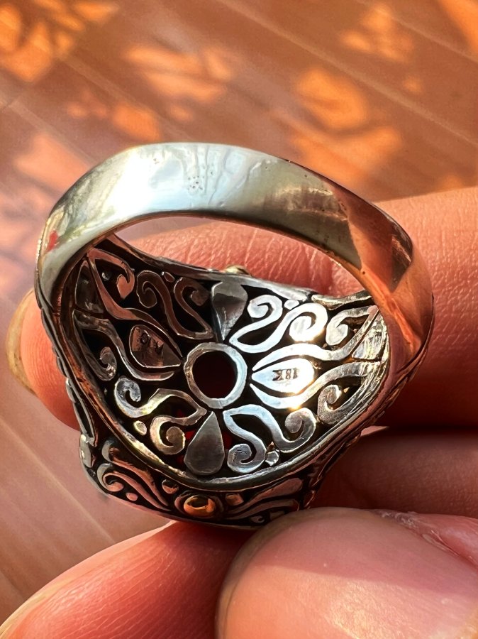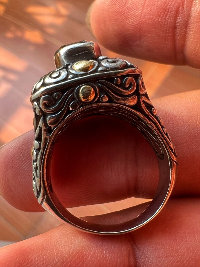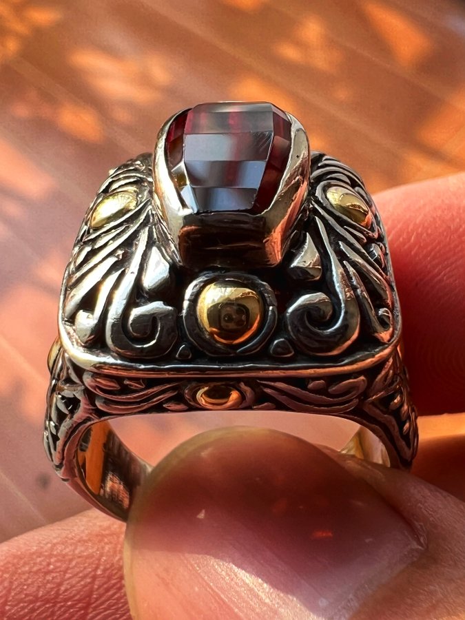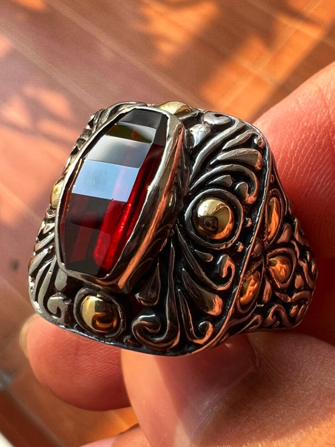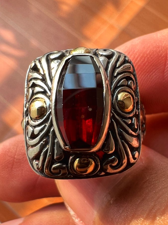 Nhẫn bạc 925 ốp vàng 18k hiệu BJC Samuel Bemham phôm bự hoa văn sắc nét đính Garnet đỏ đa giác rất đẹp, size 18.5mm - bản ngang 20mm, nặng 13.15gram (3.5 chỉ), giao thông 5tr2❤️ Thiên 0923.12.6789