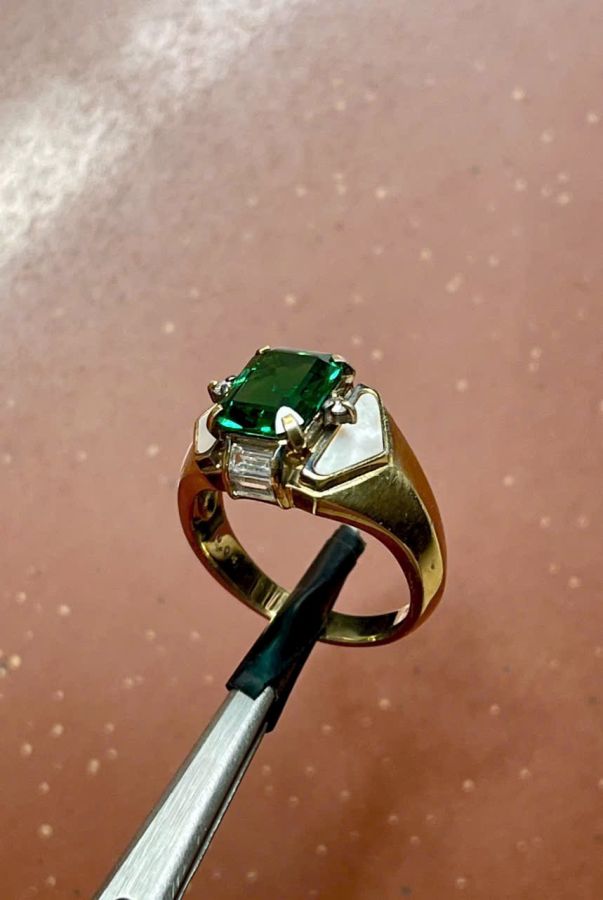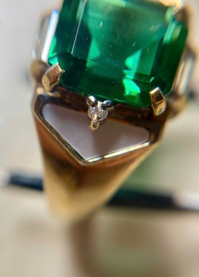 Nhẫn bạc ngoại bọc vàng 18k hiệu vip IEI đính đá ossidian xanh cắt giác đẹp , 2 bên 2 viên kim cương thiên nhiên 2ly trắng đẹp ( nặng 0,04 carat ) Ni 16mm