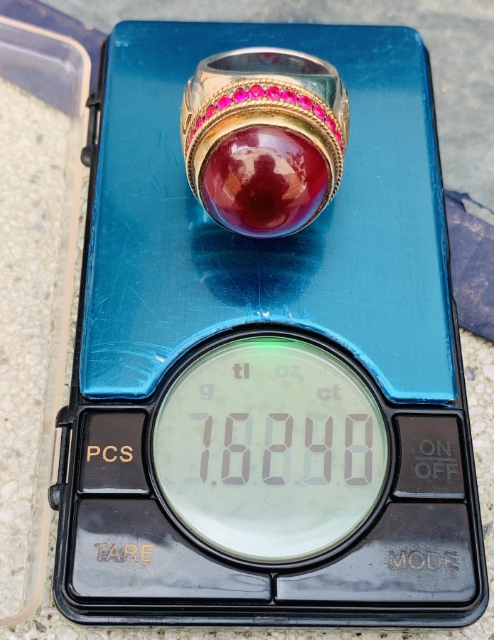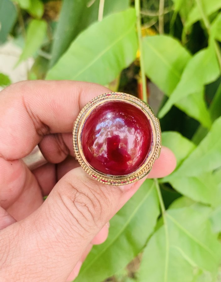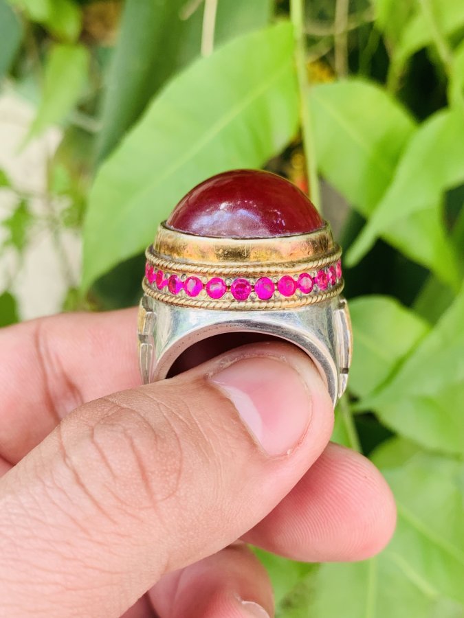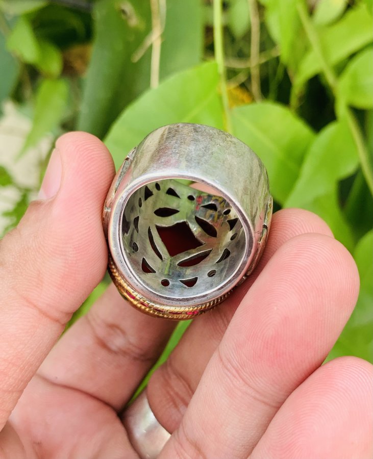 Nhẫn bạc phong cách ả rập siu to khổng lồ. Đá to 22ly thông đèn đỏ chót. Nặng hơn 16 chỉ. Size 20- 20,5.