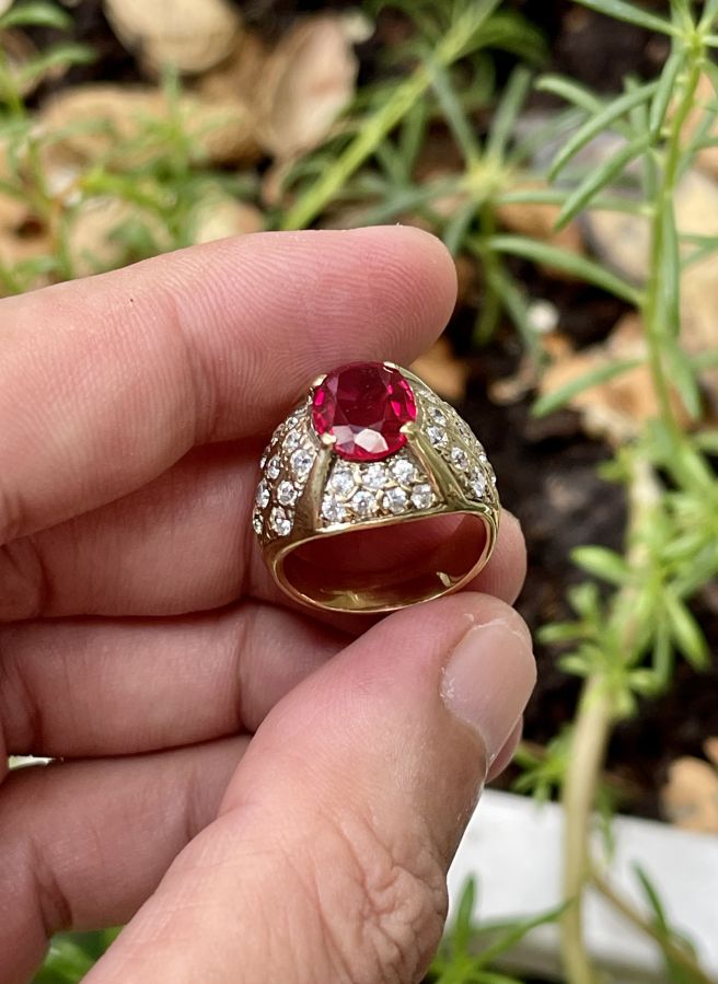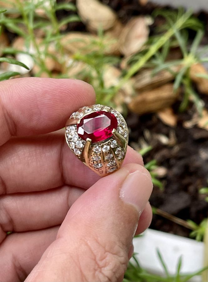 Nhẫn bạc ngoại 925 mạ vàng 18k , đính xoàn tấm cz , viên chủ ruby mài giác( độ cứng 9mohs ) Ni 17mm lh 0938968896 zalo or call