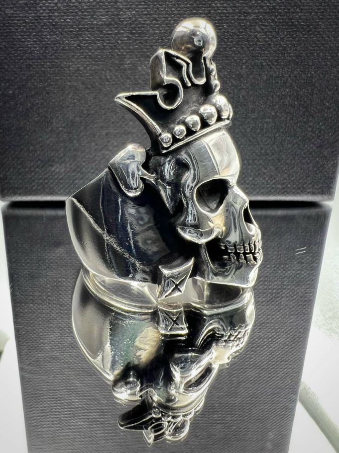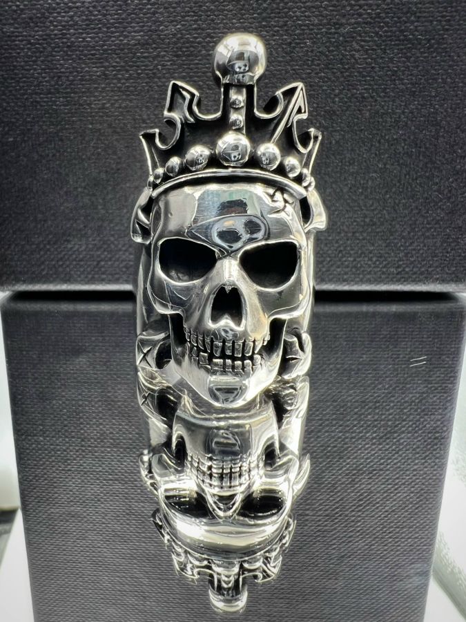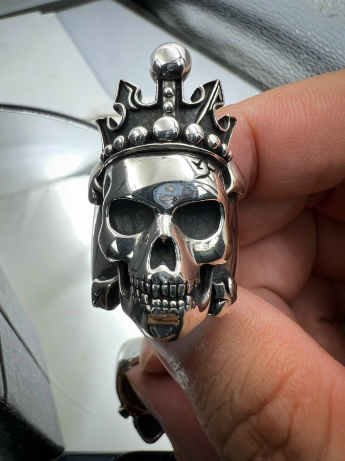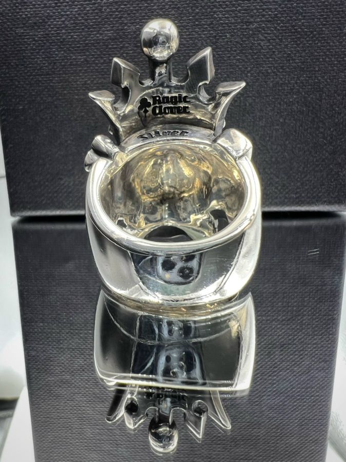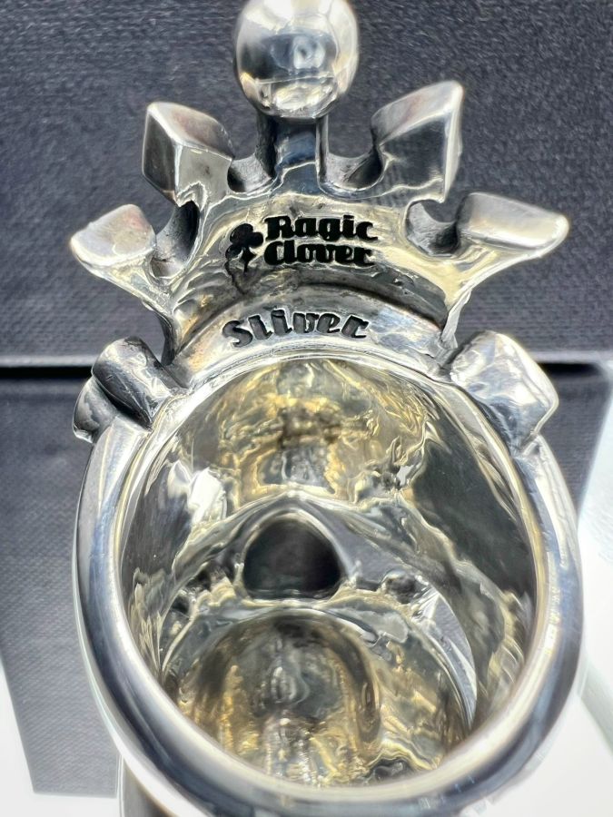 Nhẫn đầu lâu bạc 925 hiệu Ragic Clover hoa văn sắc nét rất đẹp, phôm bự hầm hố, size 18.5mm, bản ngang 39mm, nặng 43.1gram (11.49 chỉ)