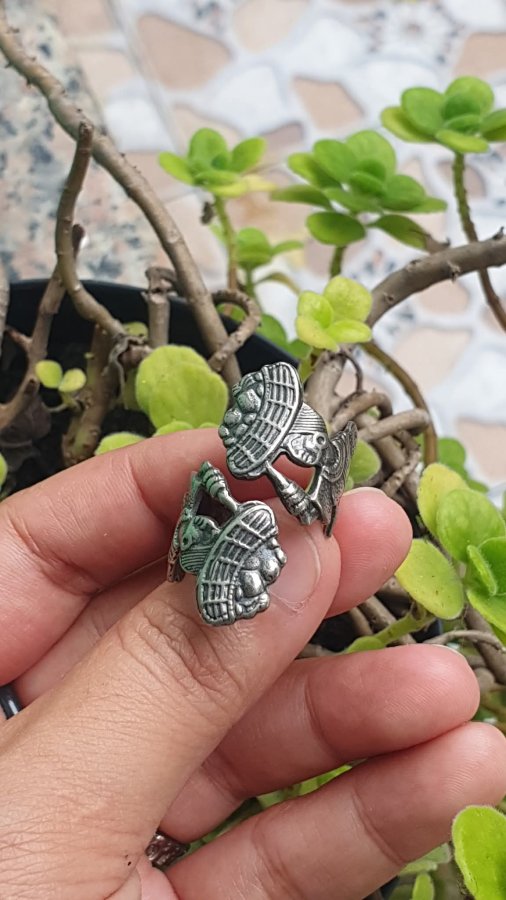 Nhẫn điêu khắc họa tiết dân tộc rất tỉ mỉ, dáng hở phù hợp mọi kích thước. Tiệm chưa đi phổ nhưng khả năng là bạc rất cao ạ 🥰
