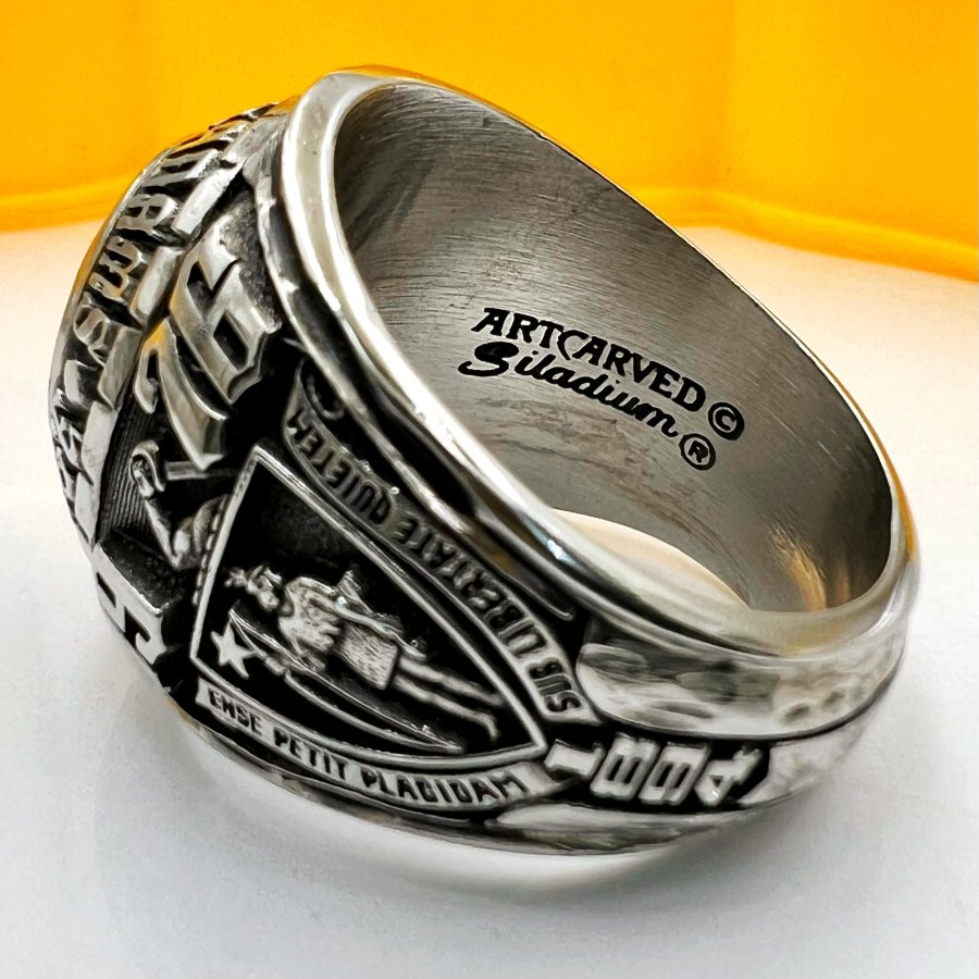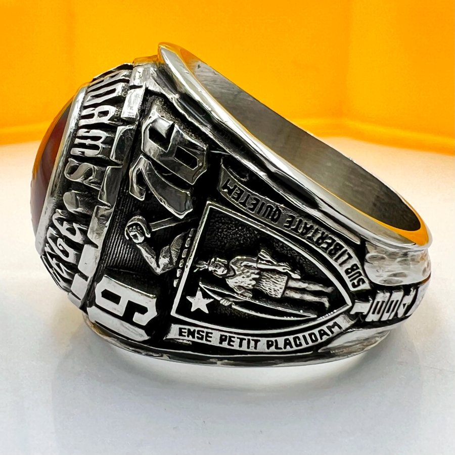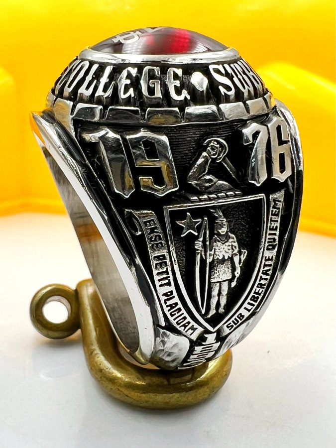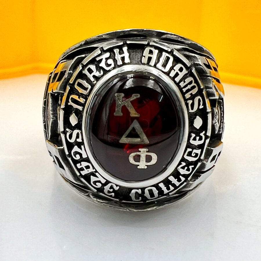 Nhẫn hợp kim đại học North Adams năm 1976 mới tinh phôm bự hoa văn sắc nét đá đỏ mo khảm logo rất đẹp, size 20mm - bản ngang 23mm, giao thông 6tr❤️ Thiên 0923.12.6789