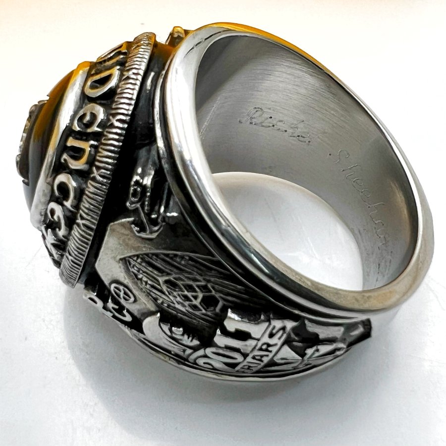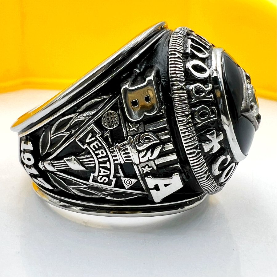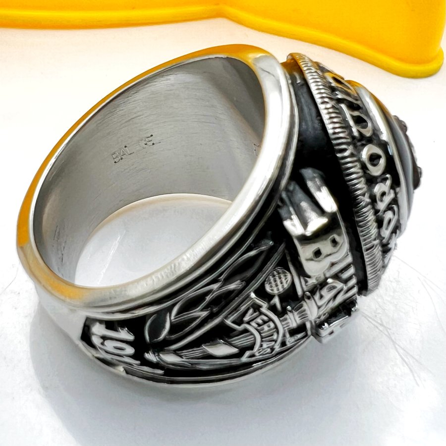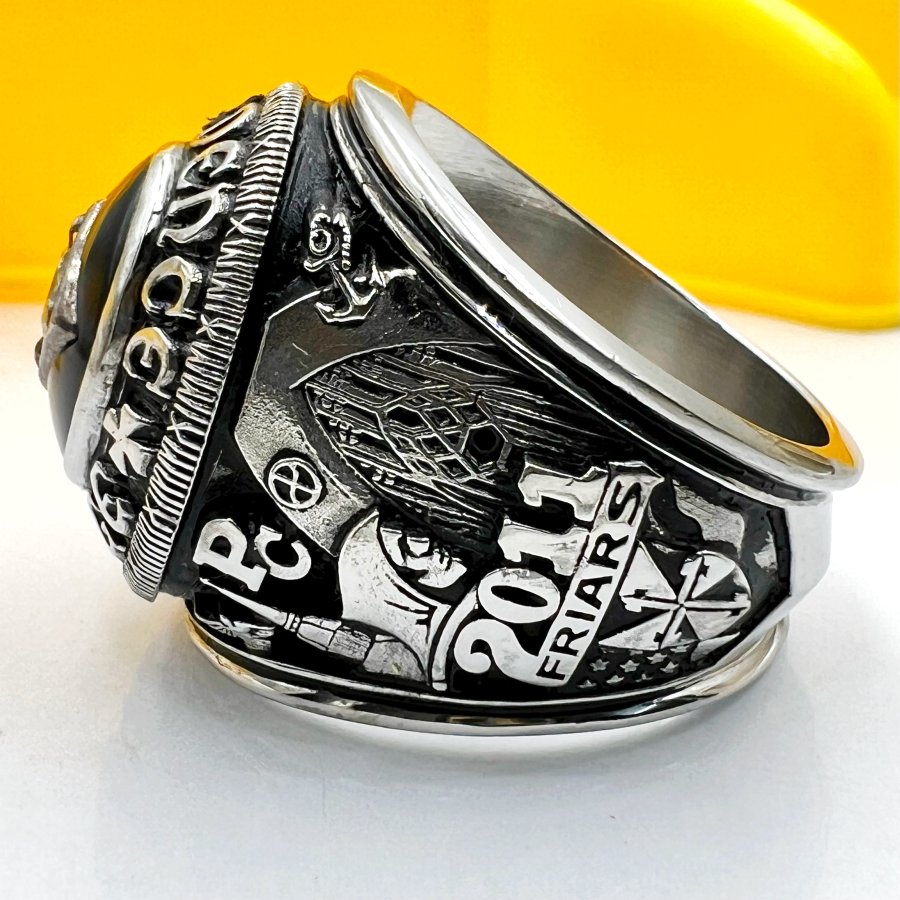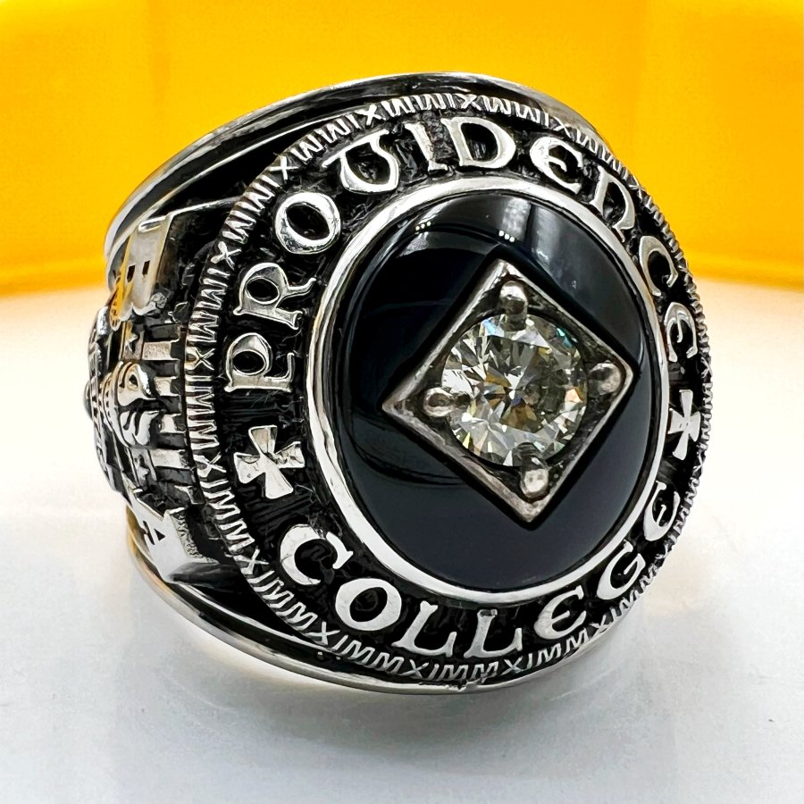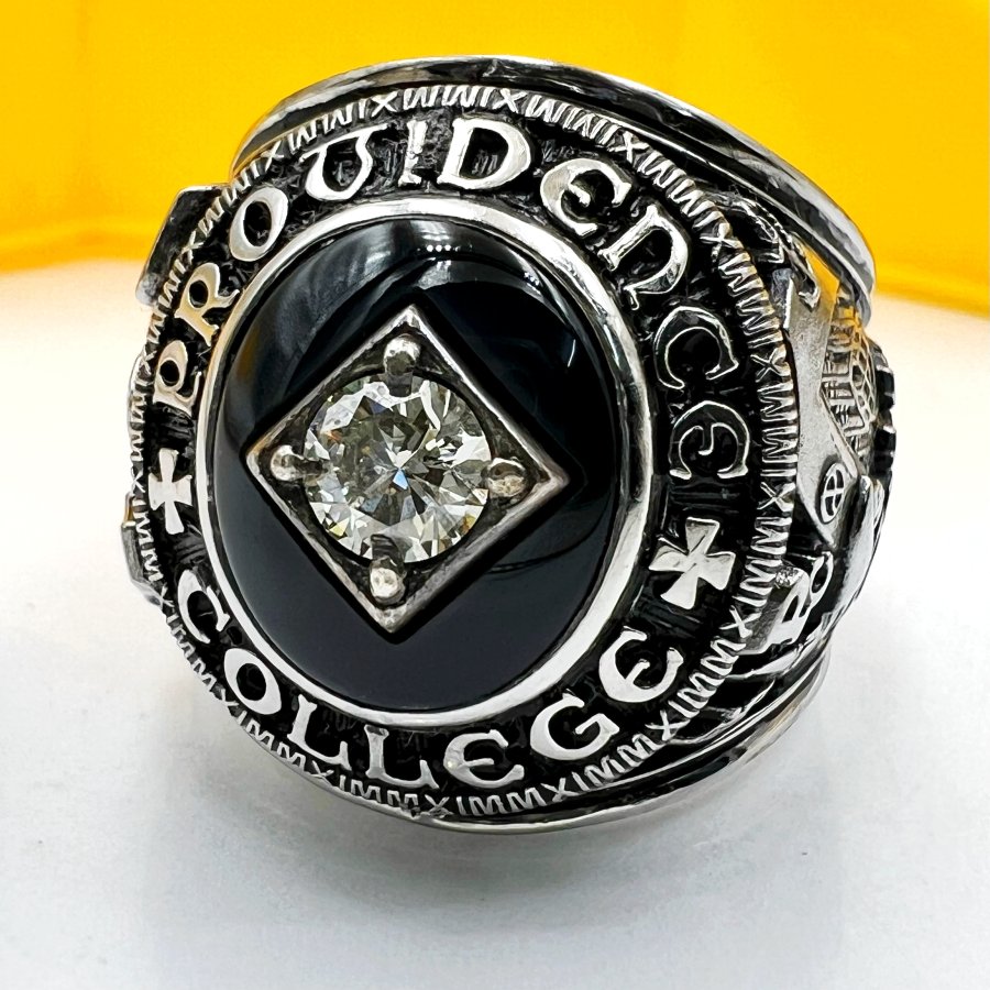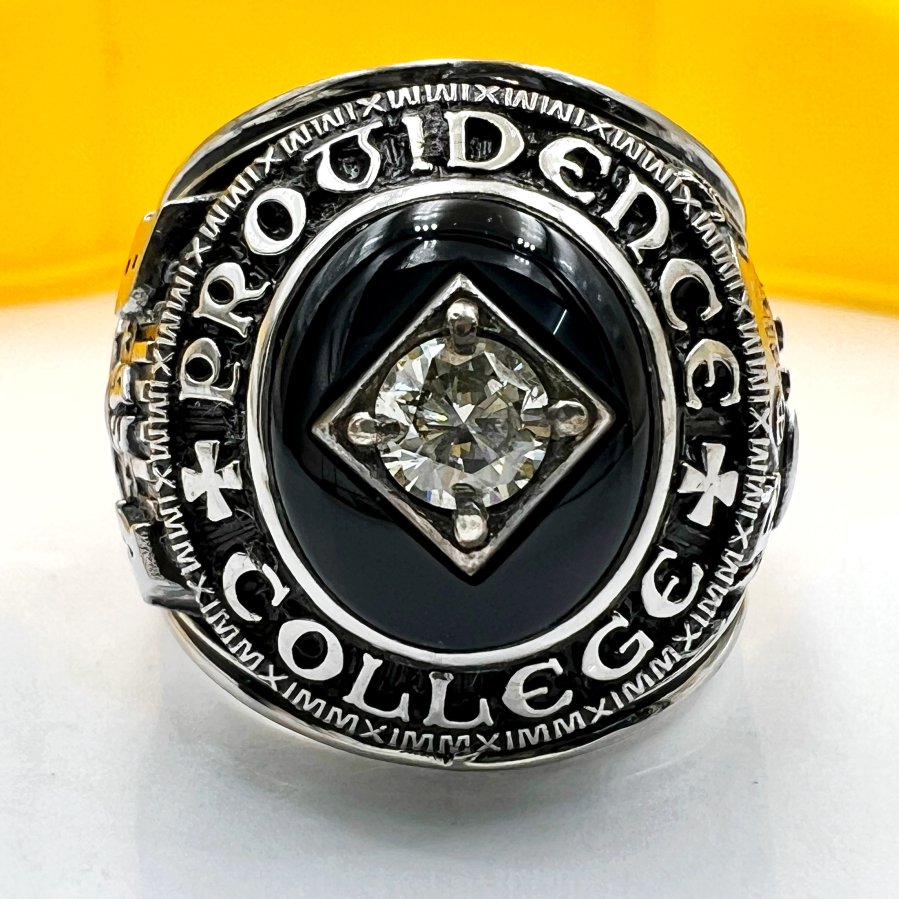 Nhẫn hợp kim trường công giáo Providence năm 2011 mới tinh phôm bự hoa văn sắc nét đá đen đính soàn thiên nhiên 4.9li rất đẹp, size 19.5mm - bản ngang 23mm, giao thông 25tr❤️ Thiên 0923.12.6789