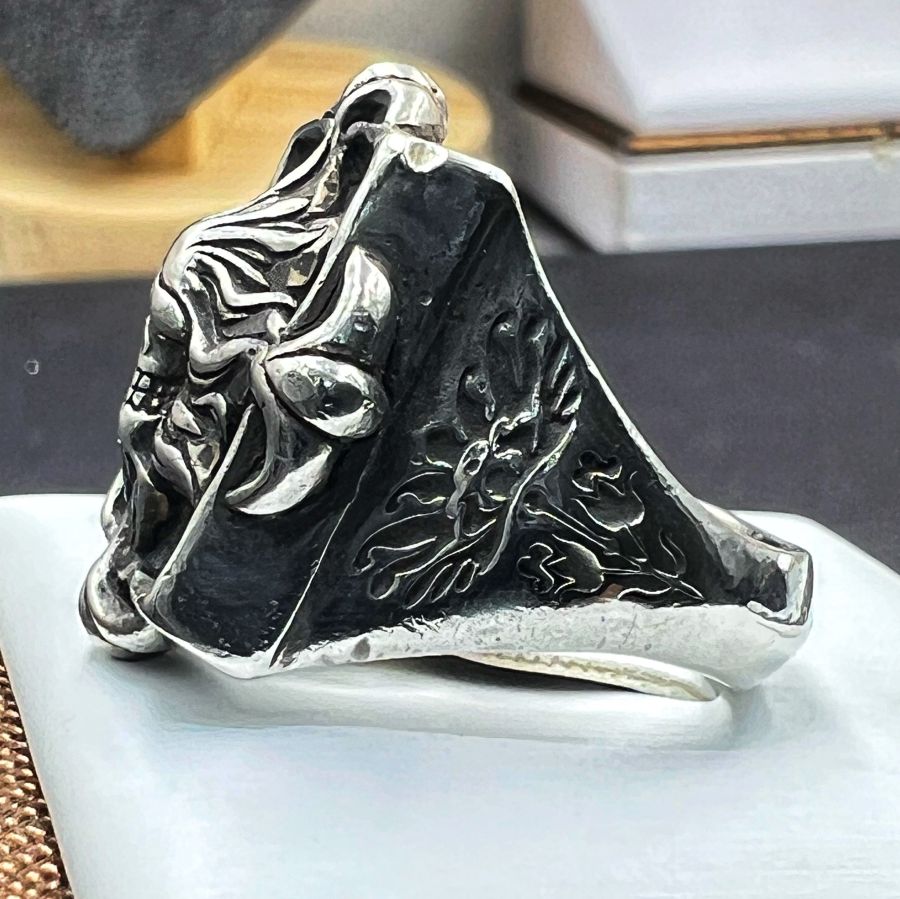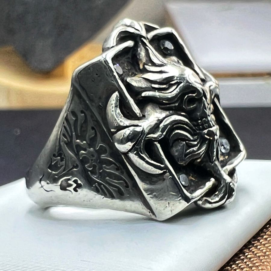Nhẫn mặt quỷ bạc 925 Nhật hàng hiệu mới tinh hoa văn sắc nét đính soàn cz rất đẹp, phôm bự, size 18mm - bản ngang 24mm, nặng 21.1gram (5.63 chỉ)