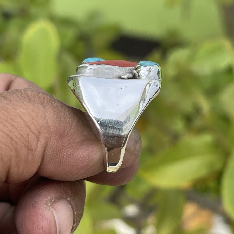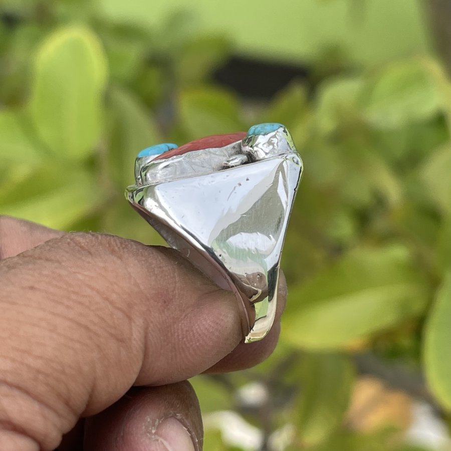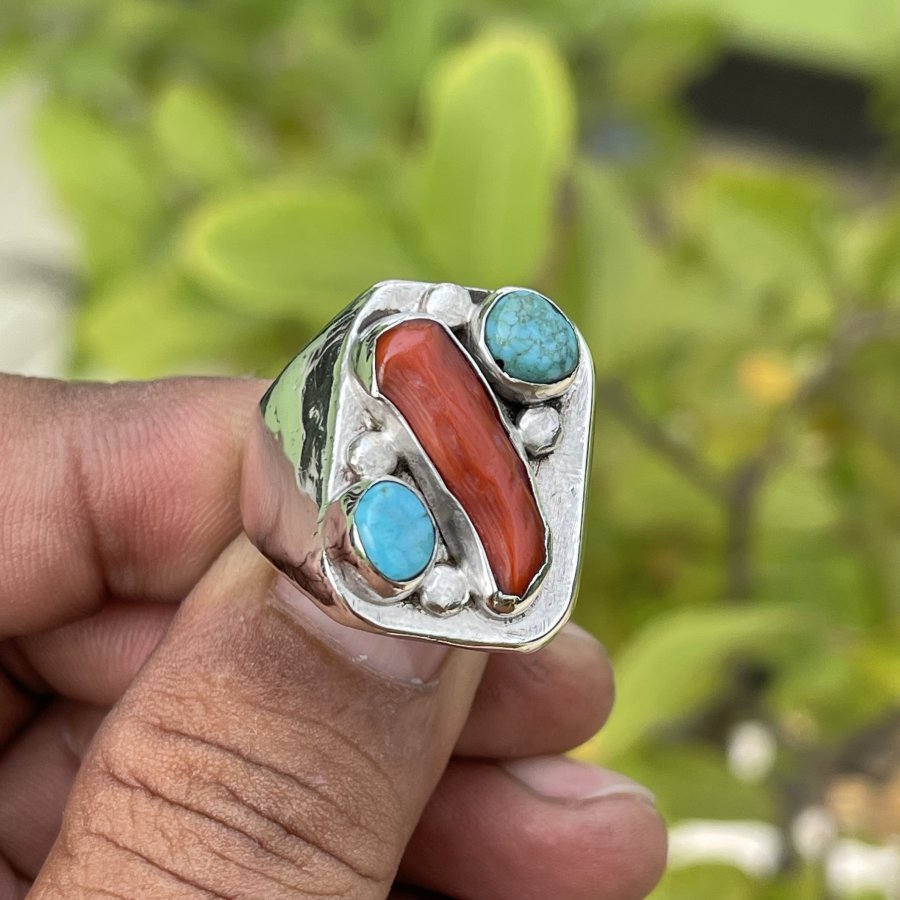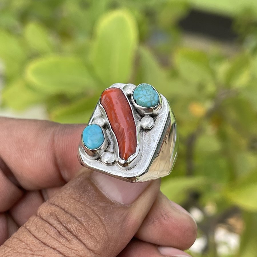 Nhẫn ngoại Thổ dân da đỏ chế tác thủ công đính ******* đỏ & đá ngọc lam ( Tất cả thiên nhiên ) - Chất liệu bạc nguyên khối 925 - Trọng lượng 4chỉ555 - size trong lòng 20,5 - size mặt nhẫn 23 - tình trạng đã spa nhẹ đẹp - giá chuẩn 1.666k ( Miễn trả giá ) Kính mời