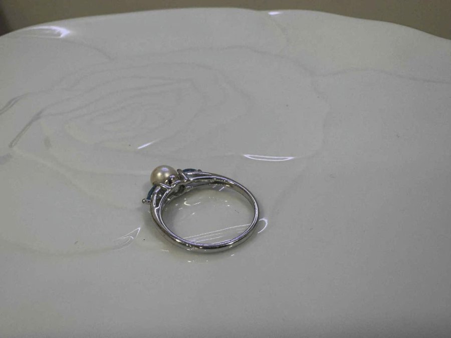 Nhẫn ngọc trai bạc hiệu Poster. Ngọc trai Akoya 6,5mm. 2 bên 2 viên Topaz giọt rất xinh. Size nhẫn 18,3mm. Em gl 550k Sdt 0925 230 285 em kha Hô nai biên hoa đông nai