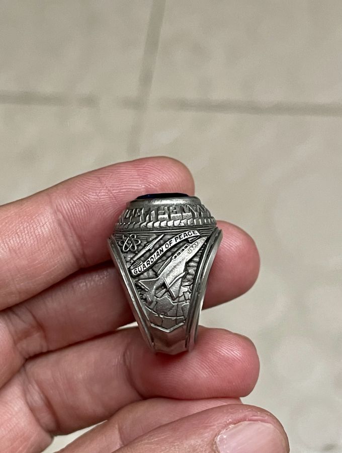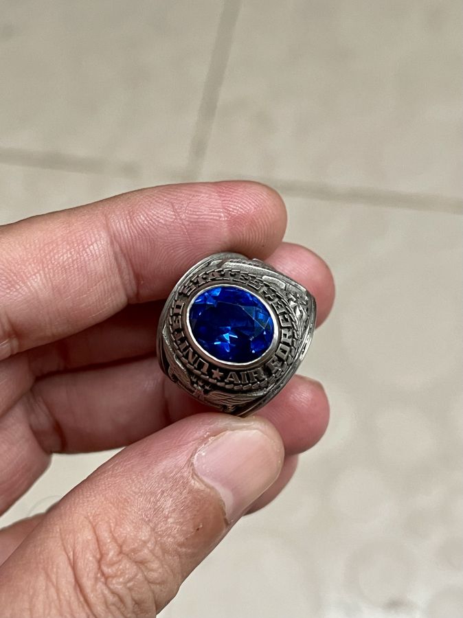 Nhẫn hợp kim chuẫn US dòng ************ không quân Hoa Kì xưa hoạ tiết sắc nét , hãng Alpha sx Hột xanh zin cắt đa giác , đai zin Size 18,5-18,8mm