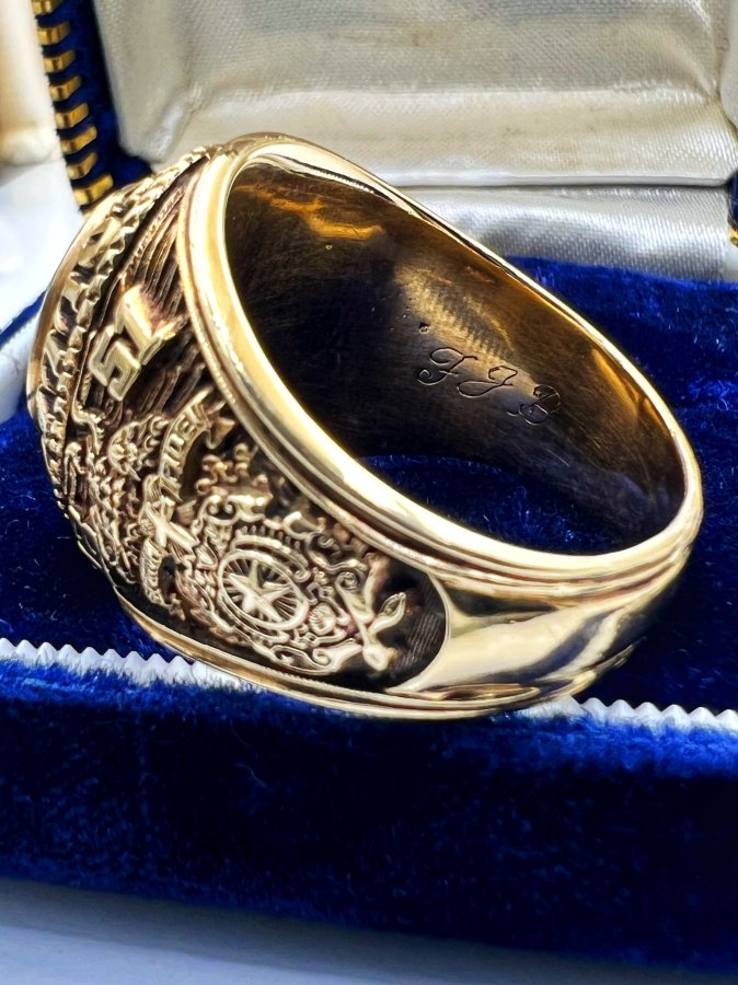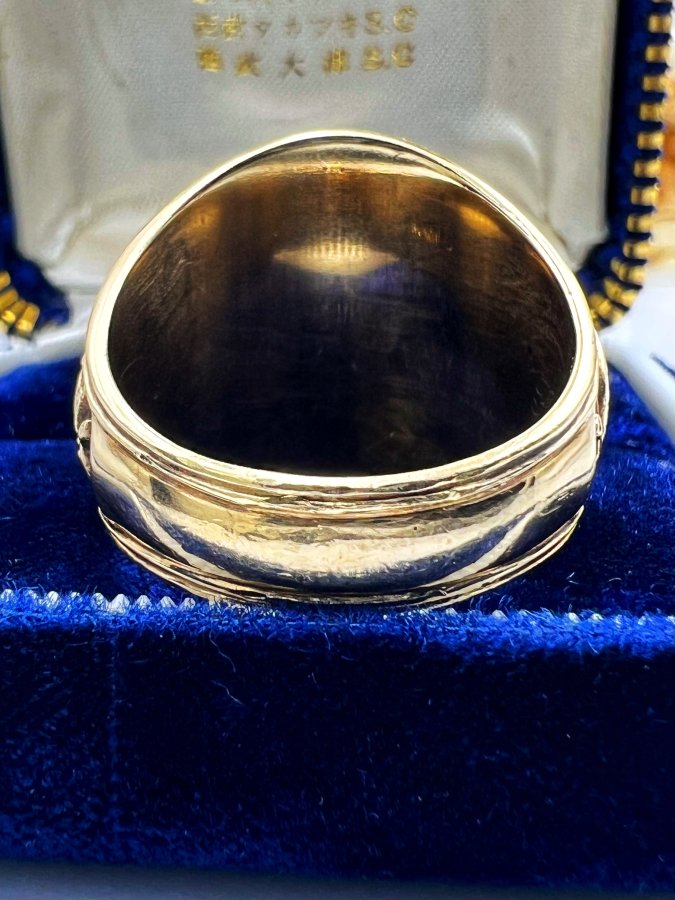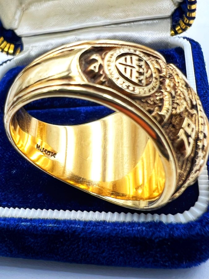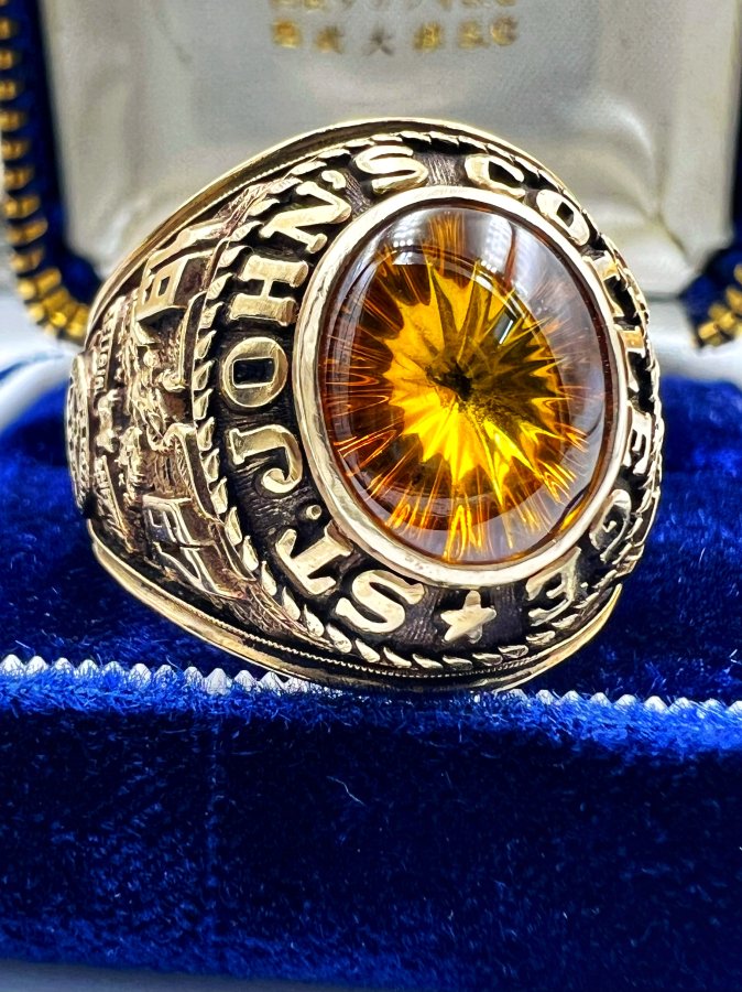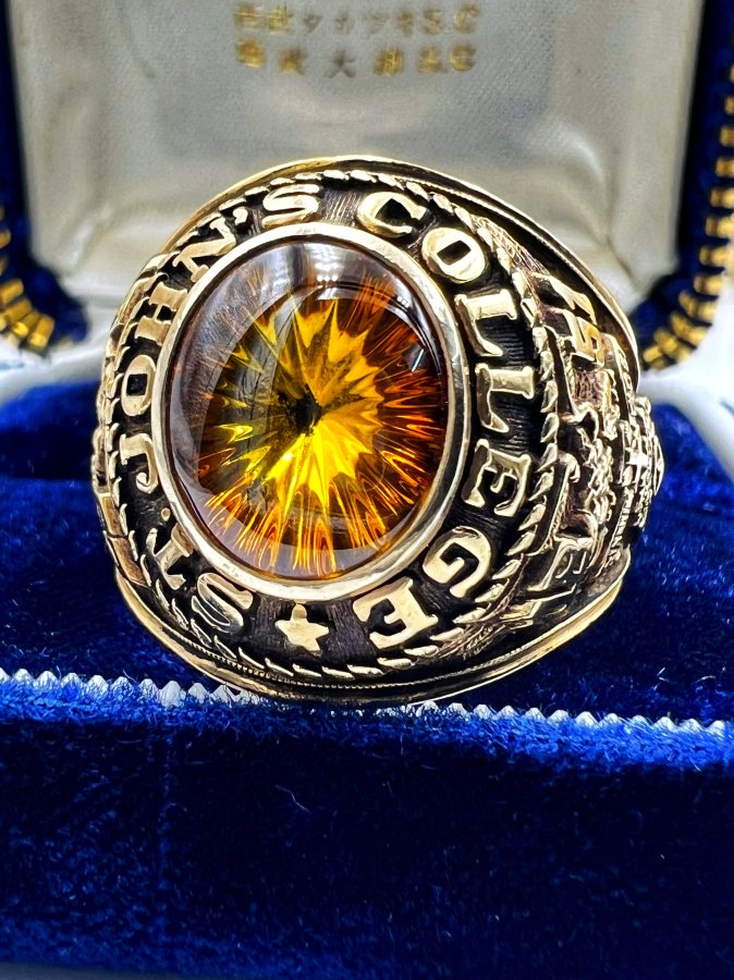Nhẫn vàng 10k công giáo St.John's College năm 1967 phôm bự hoa văn sắc nét đá vàng tia mắt mèo rất đẹp, size 20mm - bản ngang 21.5mm, nặng 19.23gram (5.13 chỉ), giao thông 39tr❤️ Thiên 0923.12.6789