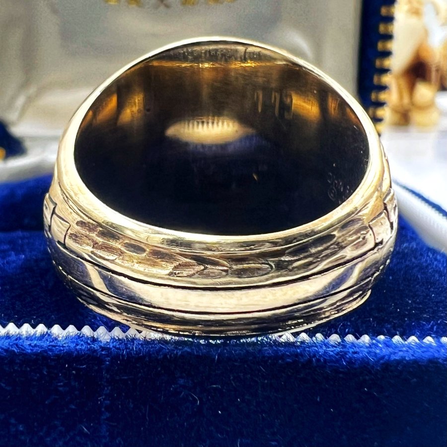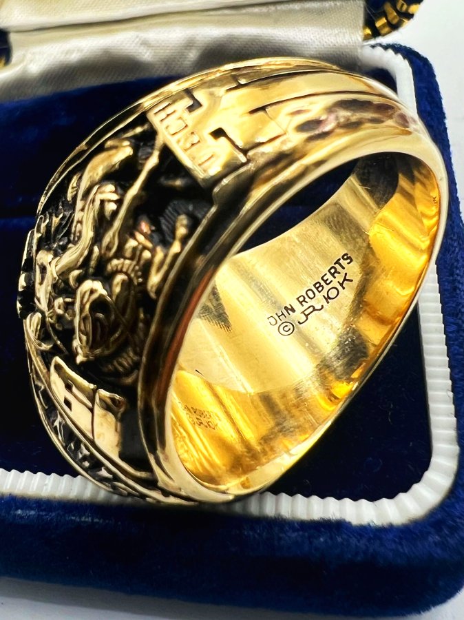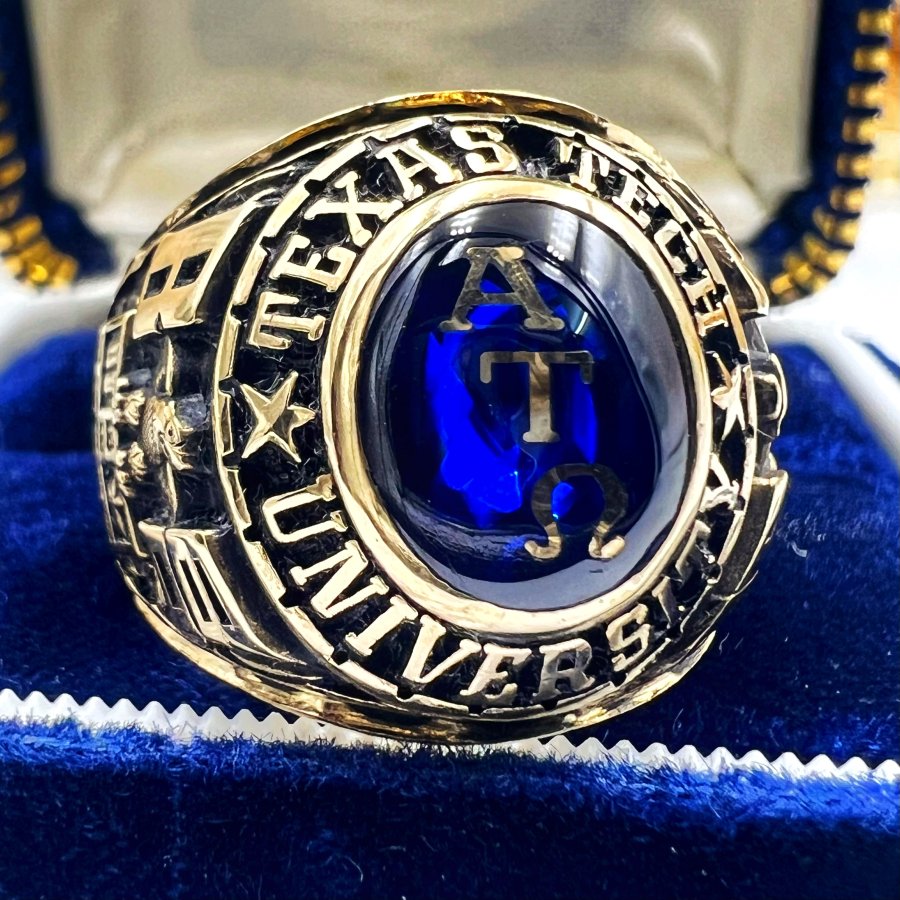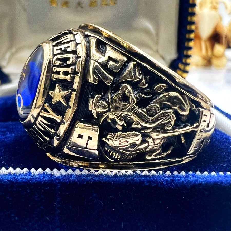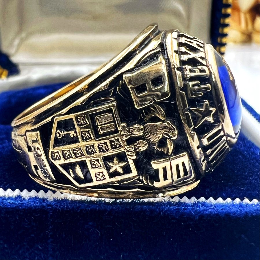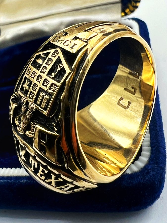 Nhẫn vàng 10k đại học texas năm 1975 mới tinh phôm bự hoa văn sắc nét đá xanh mo khảm logo rất đẹp, size 20mm - ngang 21mm, nặng 20.39gram (5.44 chỉ), giao thông 41tr❤️ Thiên 0923.12.6789