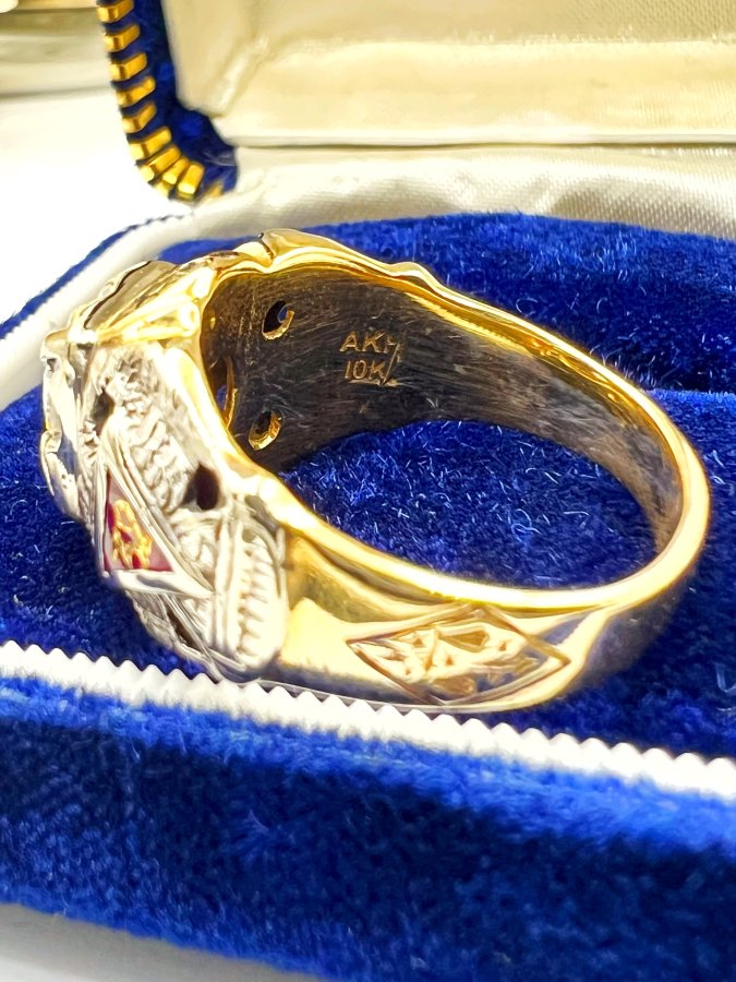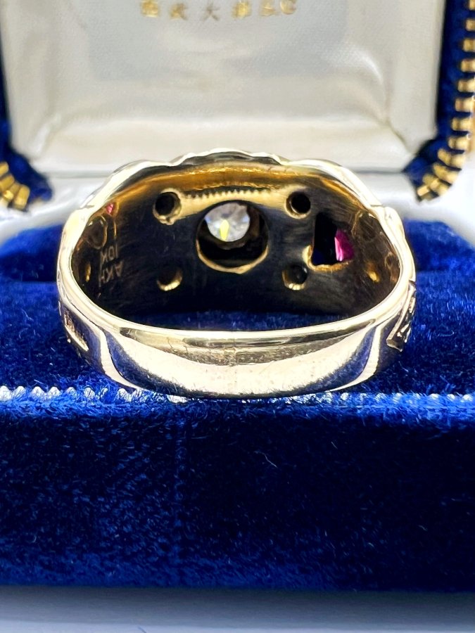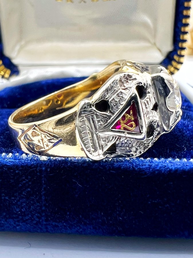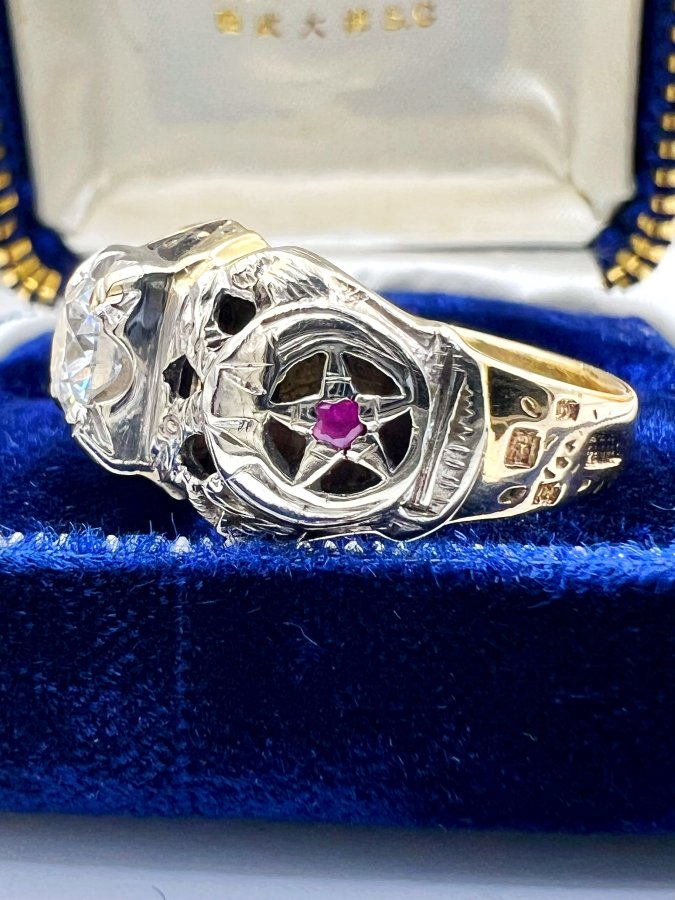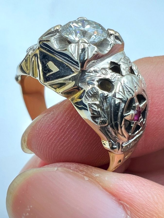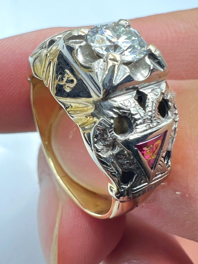 Nhẫn vàng 10k đemi 2 màu hội tam điểm Masonic hoa văn sắc nét đính soàn moisanite 6.3li rực lửa rất đẹp, size 19mm - bản ngang 14mm, nặng 9gram (2.4 chỉ), giao thông 22tr❤️ Thiên 0923.12.6789