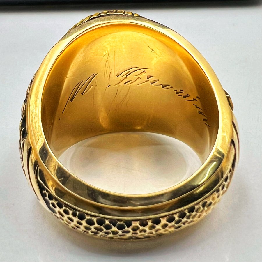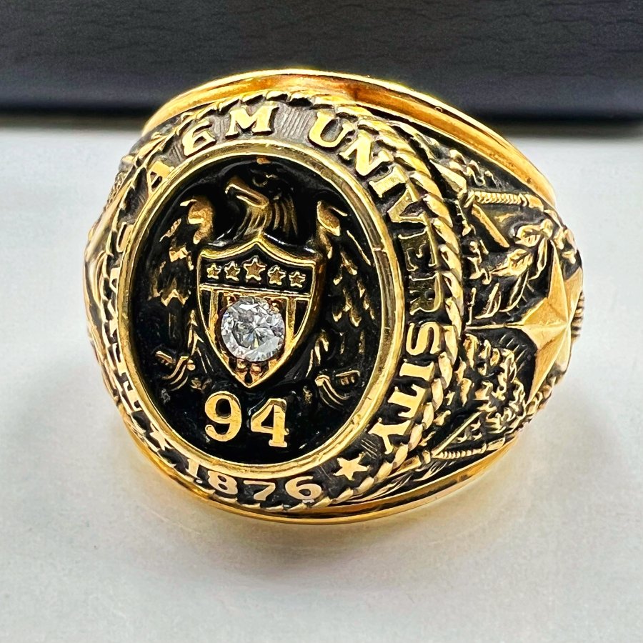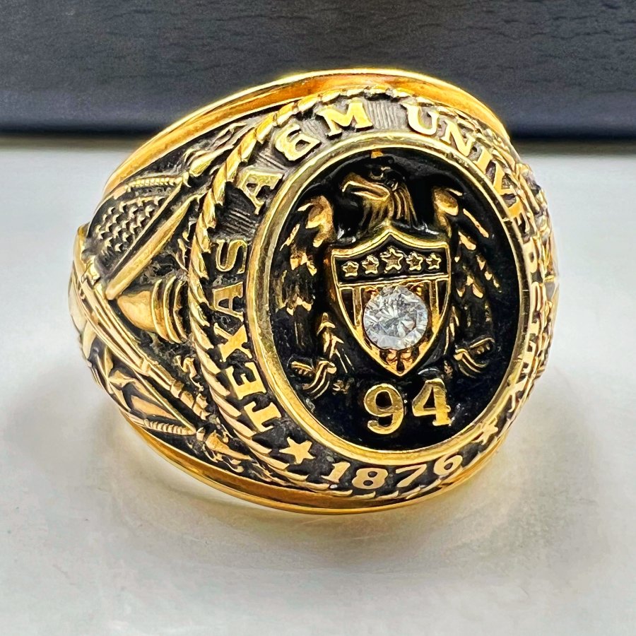Nhẫn vàng 10k trường ********** Texas A&M năm 1994 mới cứng phôm bự hoa văn sắc nét logo đại bàng đính soàn thiên nhiên 3li rất đẹp, size 18.5mm - bản ngang 20.5mm, nặng 30.25gram (8.07 chỉ), giao thông 63tr5❤️ Thiên 0923.12.6789