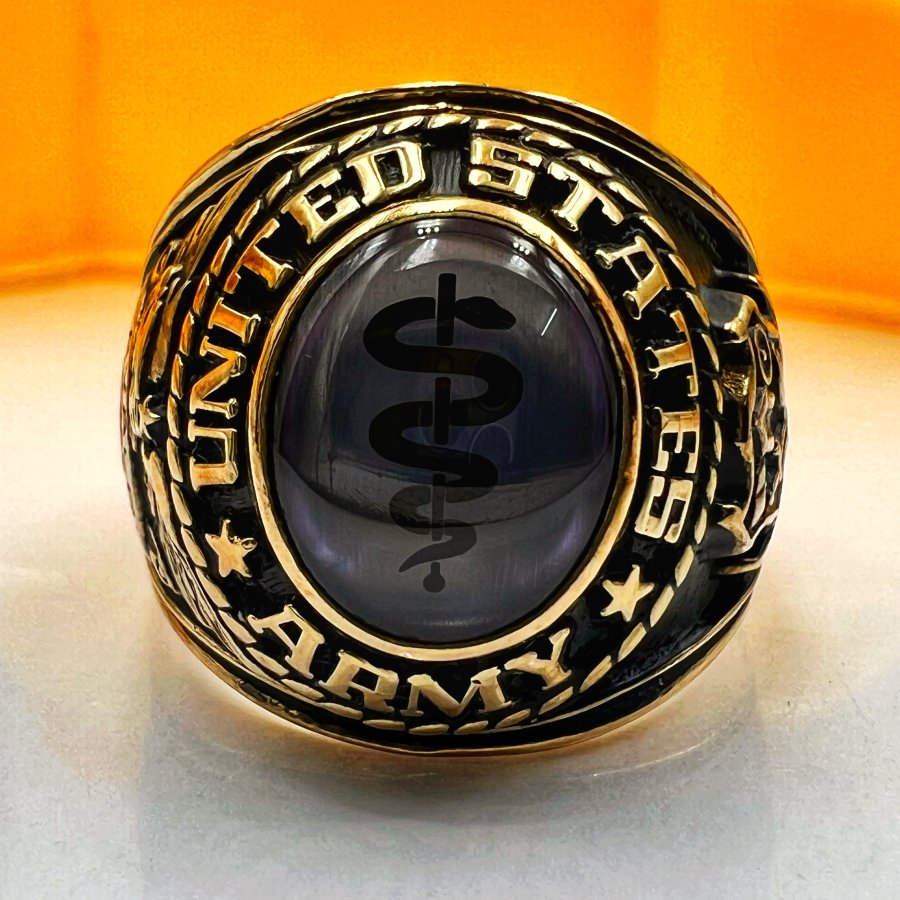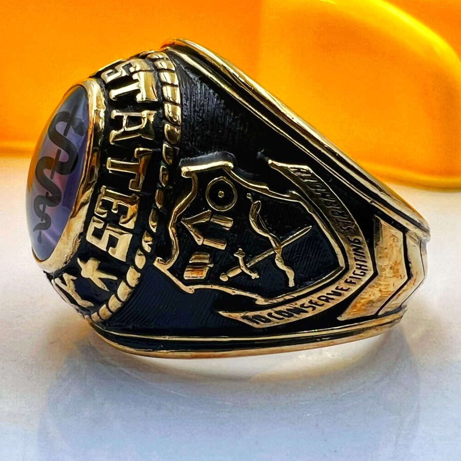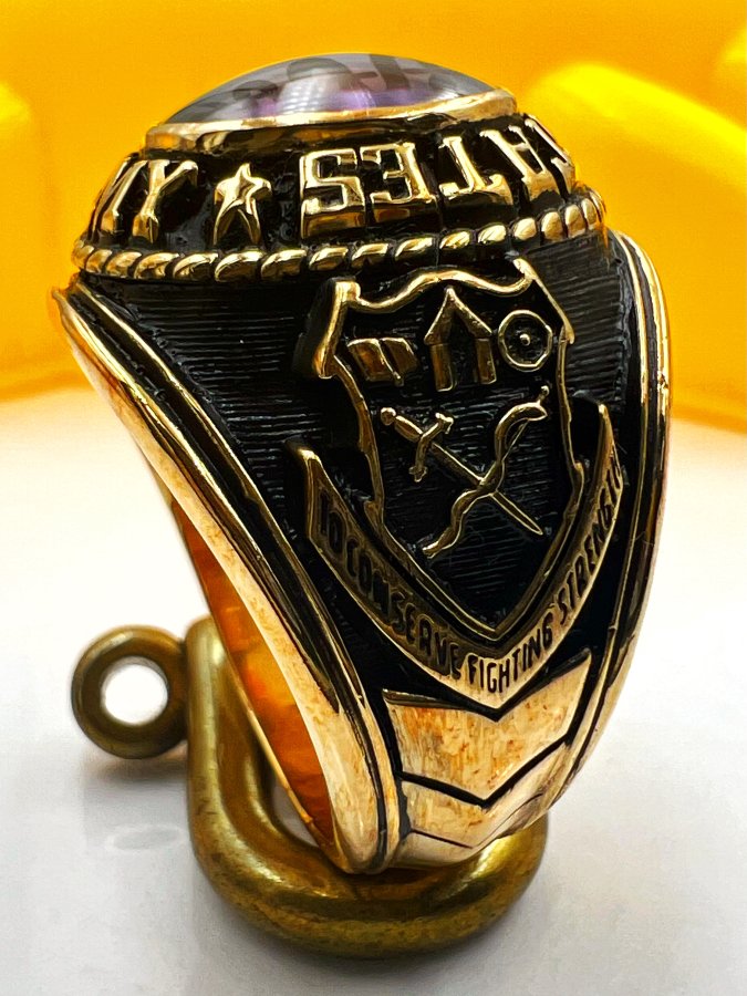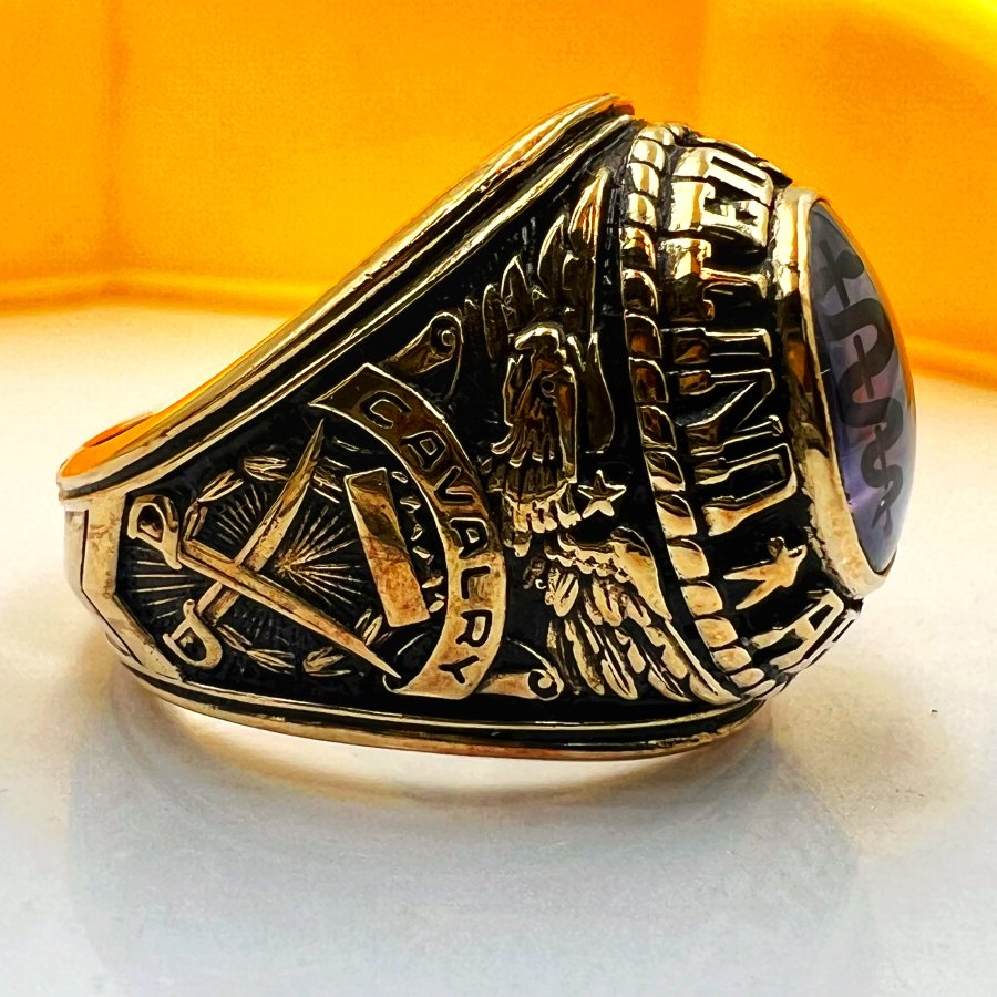 Nhẫn vàng 10k U.S Army - Cavalry phôm bự hoa văn sắc nét đá tím mo có logo Quân Y rất đẹp, size 19.5mm - ngang 21mm, nặng 18.3gram (4.88 chỉ), giao thông 36tr8❤️ Thiên 0923.12.6789