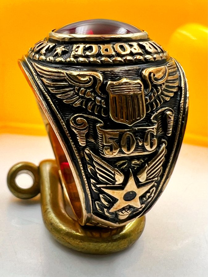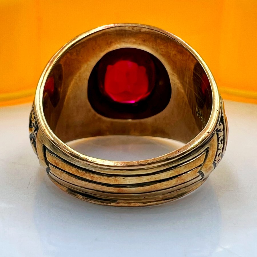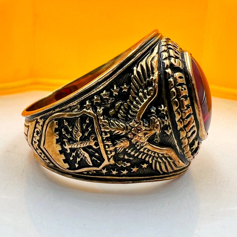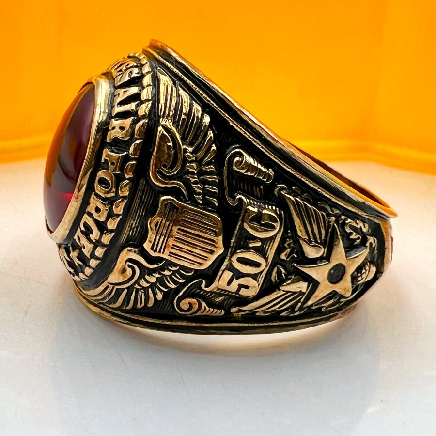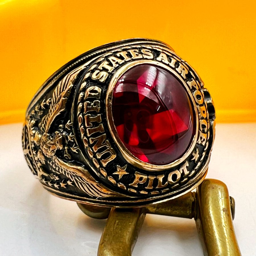 Nhẫn vàng 10k USAF Pilot năm 1950 phôm xưa hoa văn sắc nét đá đỏ huyết mo tròn rất đẹp, size 20mm - ngang 20mm, nặng 17.73gram (4.73 chỉ), giao thông 37tr❤️ Thiên 0923.12.6789