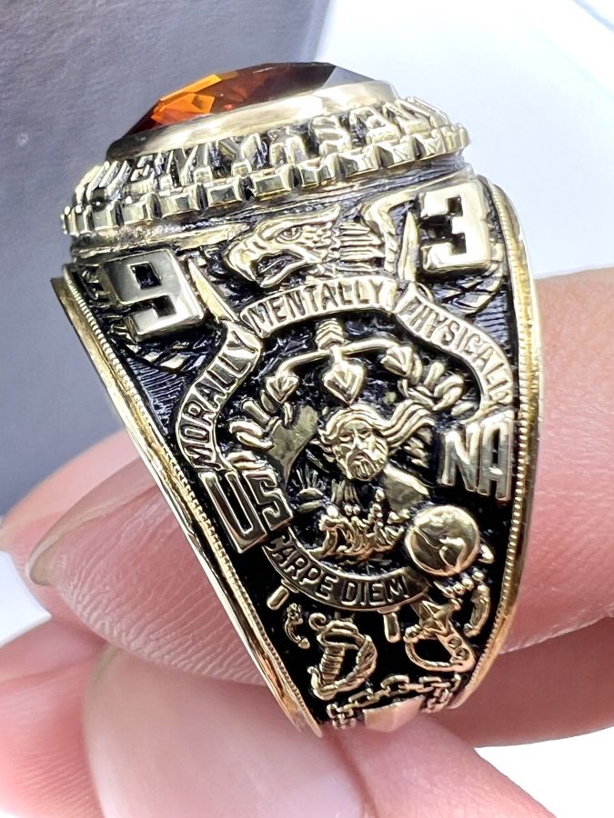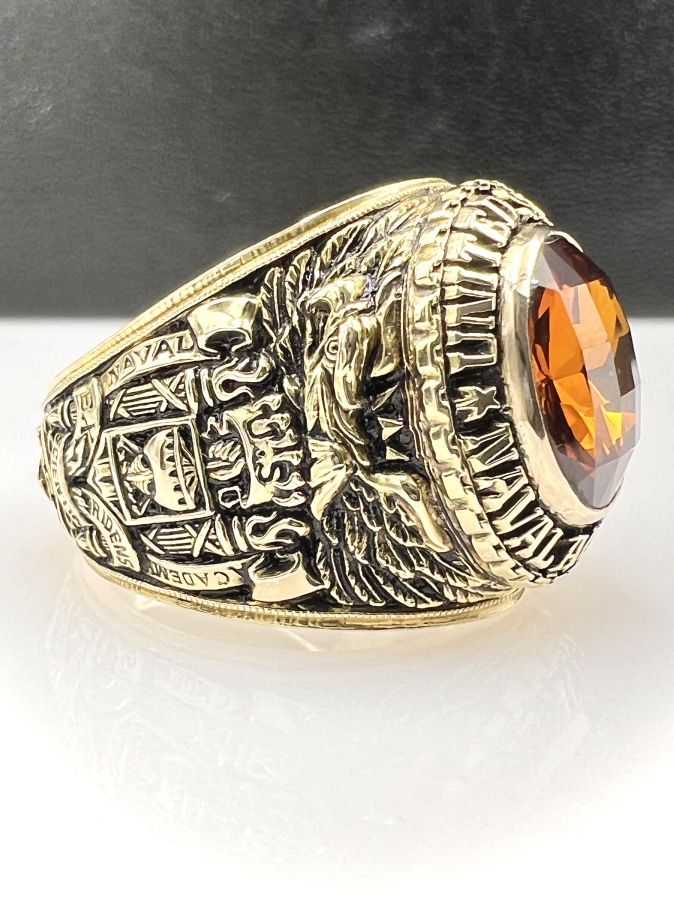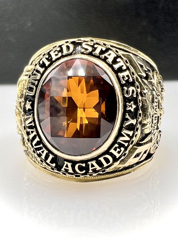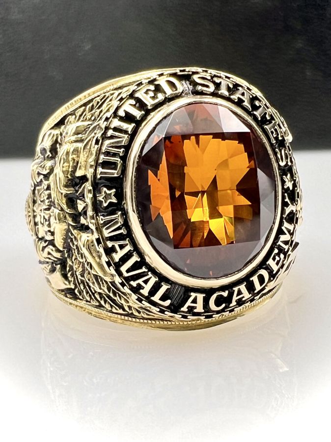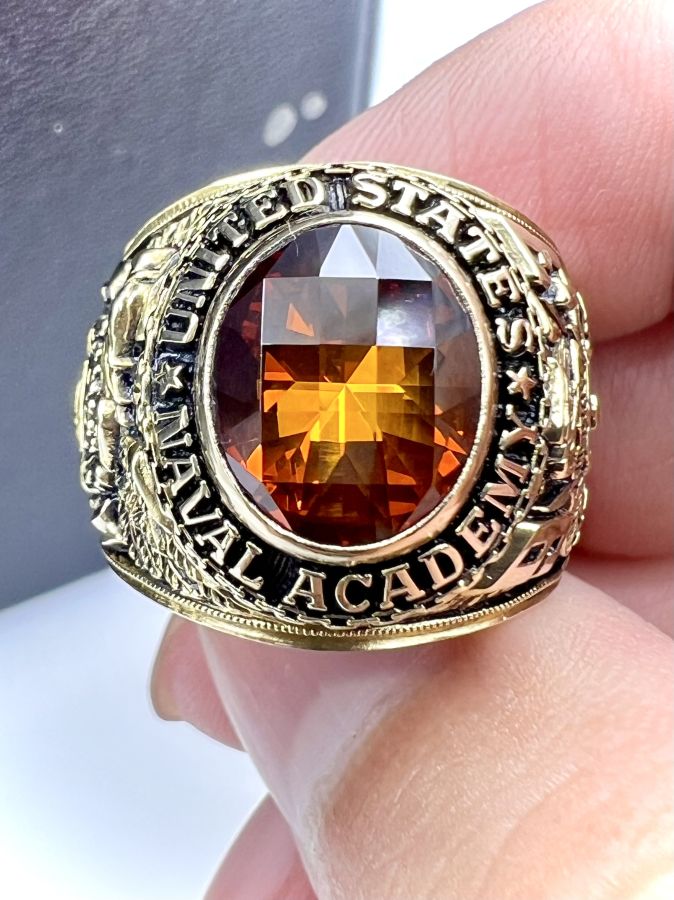 Nhẫn vàng 14k U.S Naval Academy năm 1993 mới tinh hoa văn sắc nét đá vàng hổ phách đa giác rất đẹp, size 19mm - ngang 20mm, nặng 28.45gram (7.59 chỉ) Thiên 0923.12.6789
