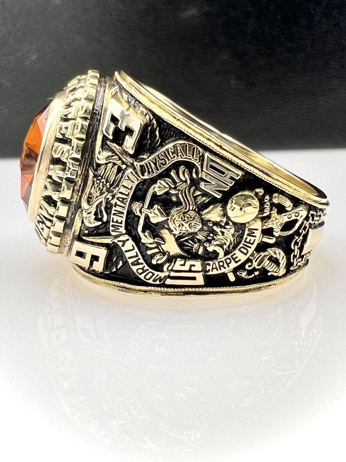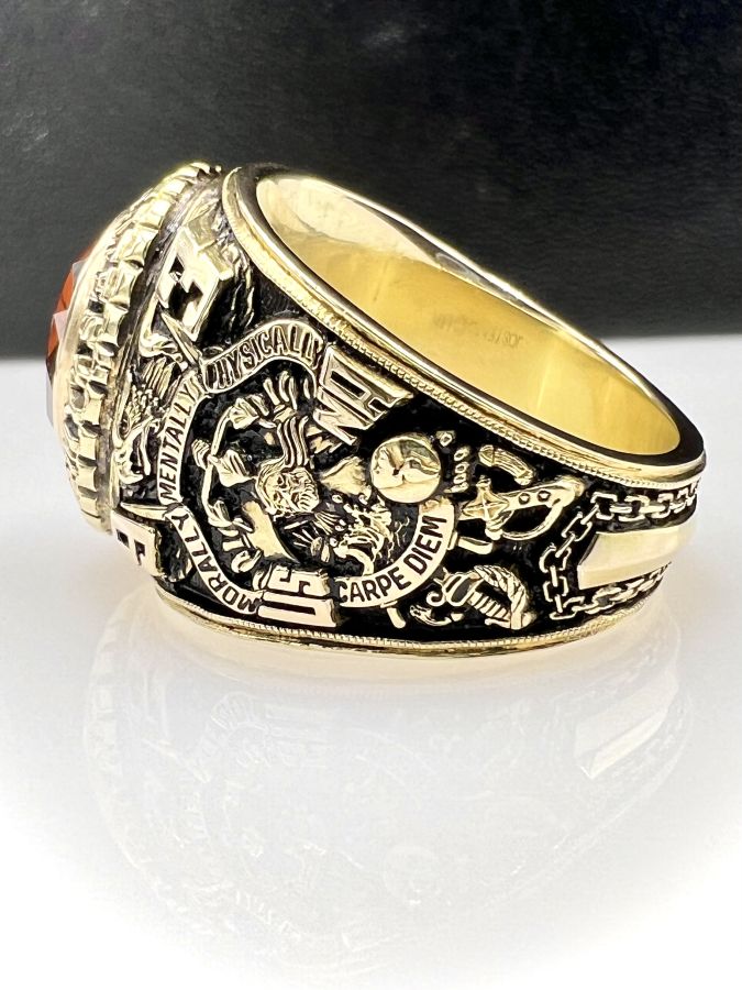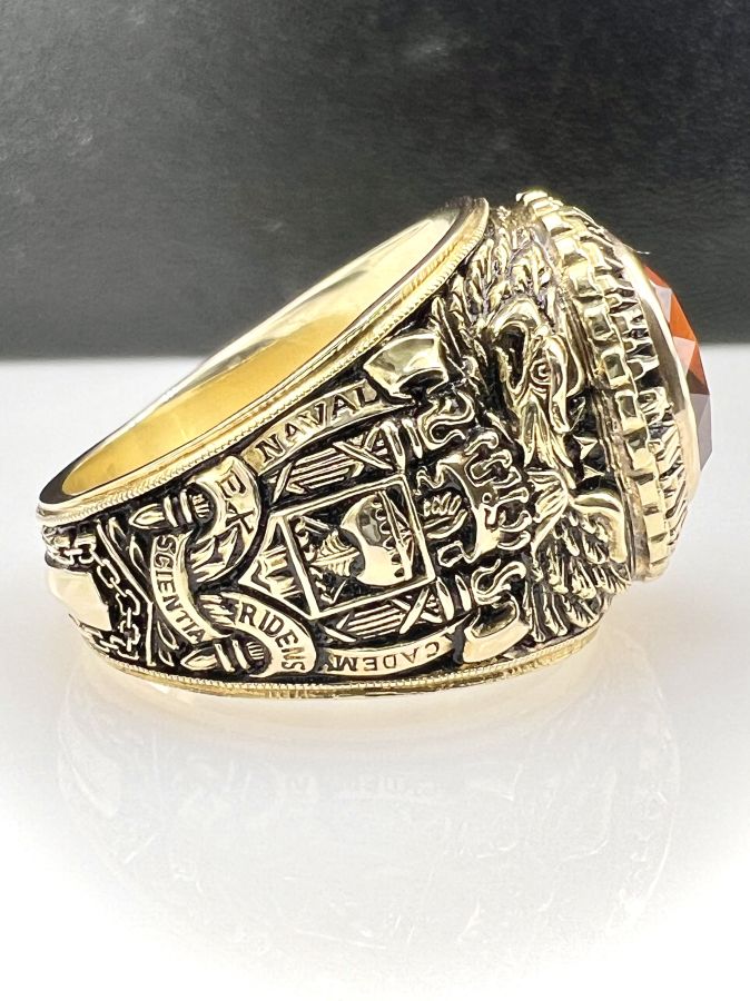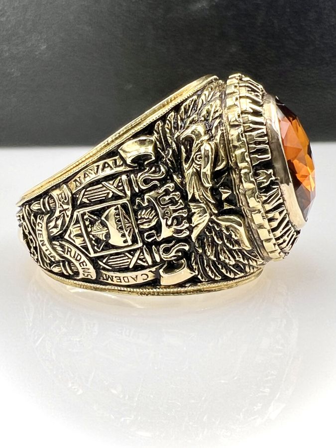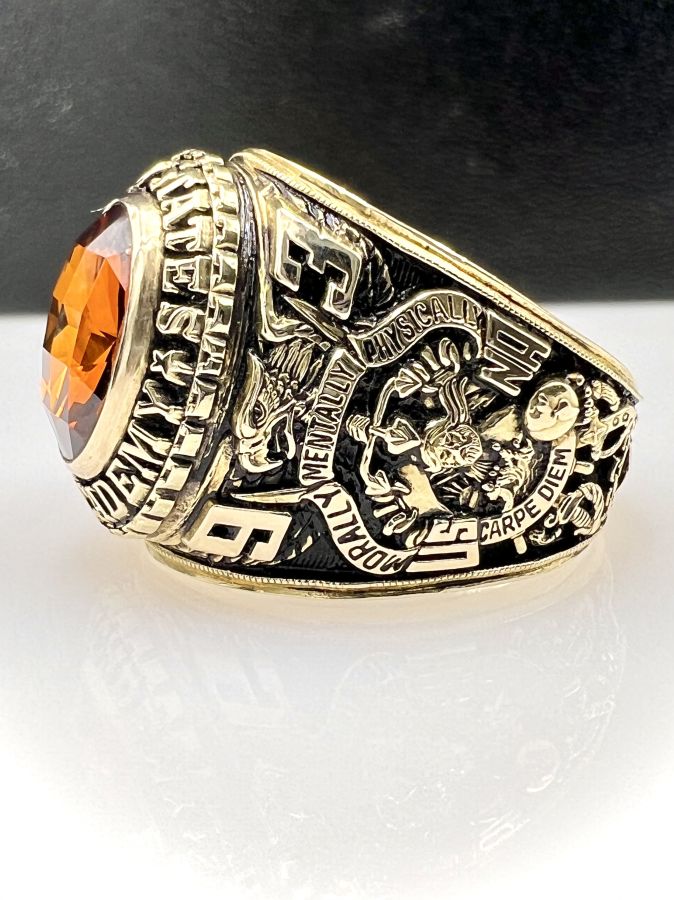 Nhẫn vàng 14k U.S Naval Academy năm 1993 mới tinh hoa văn sắc nét đá vàng hổ phách đa giác rất đẹp, size 19mm - ngang 20mm, nặng 28.45gram (7.59 chỉ) Thiên 0923.12.6789