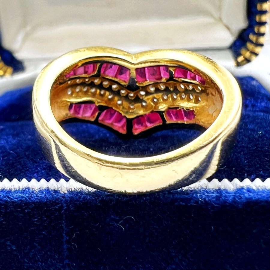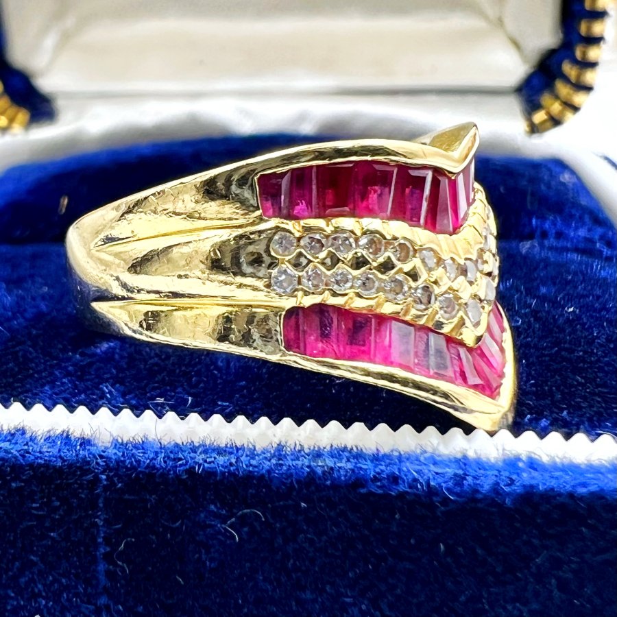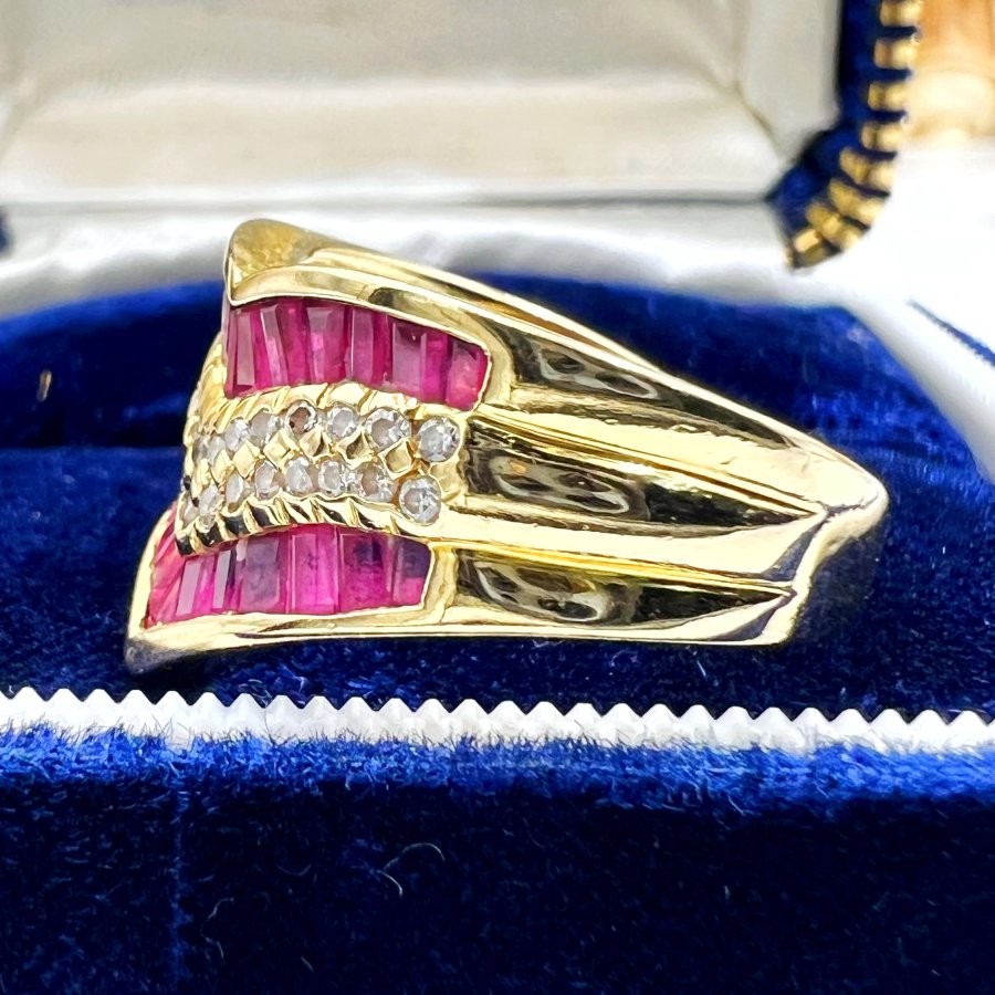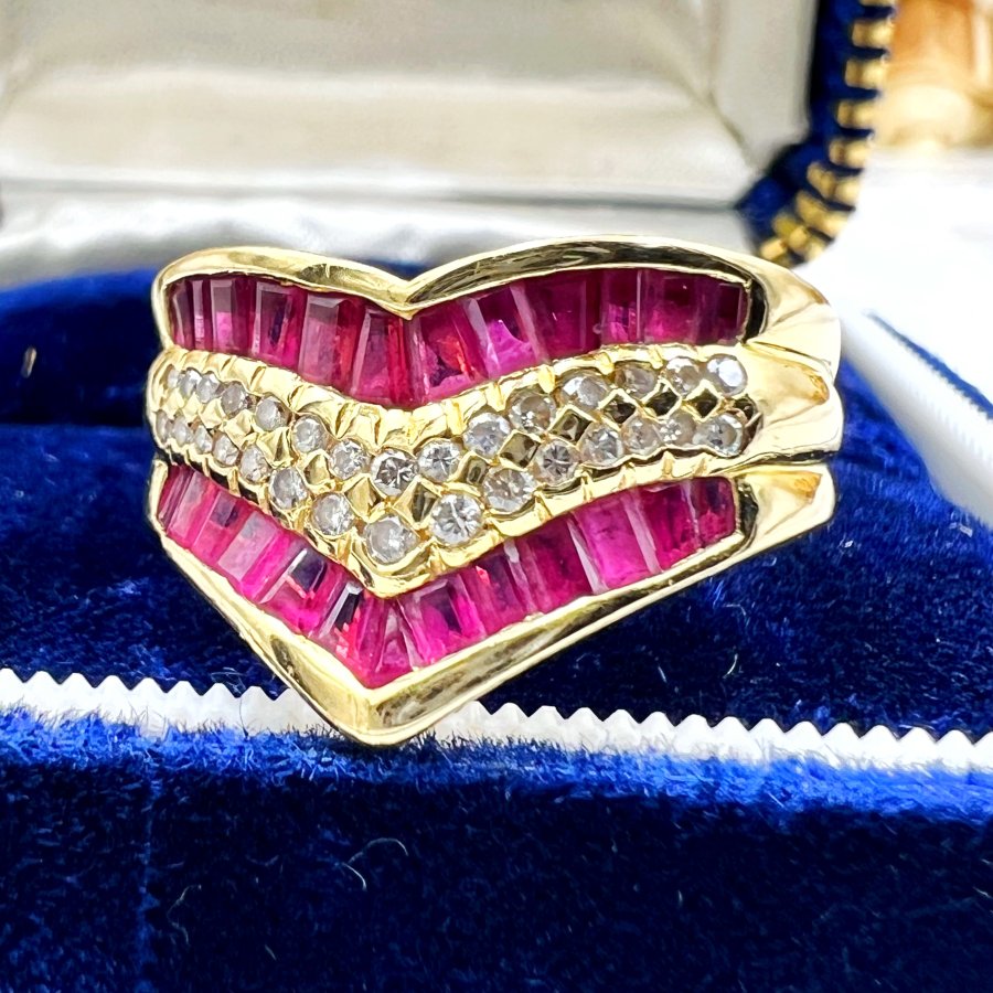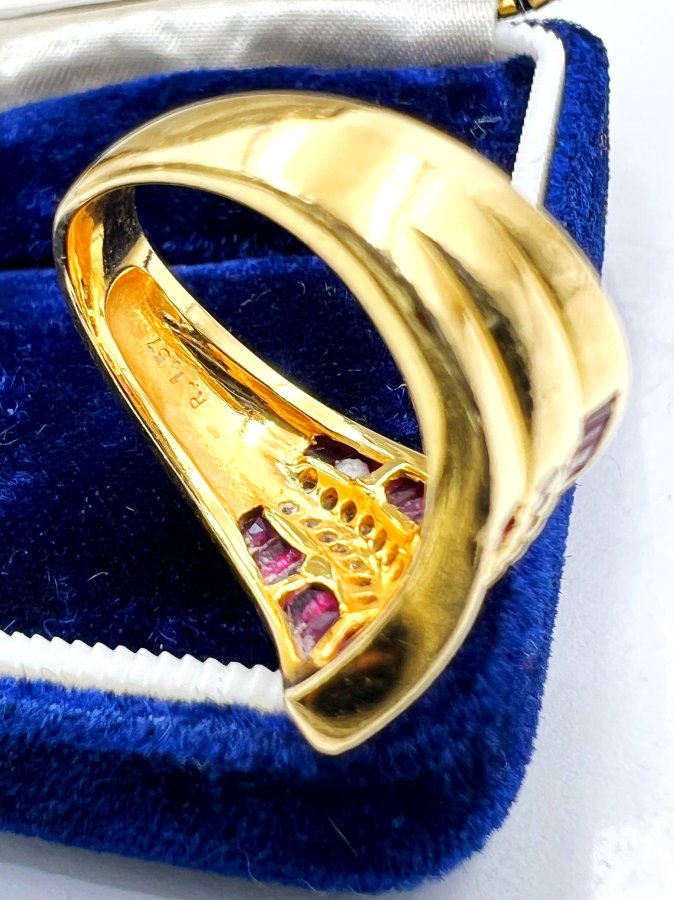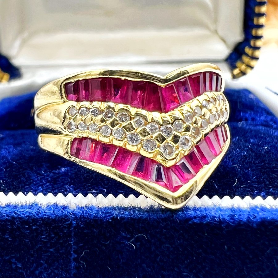 Nhẫn vàng 18k Nhật phôm bự hoa văn sắc nét đính ruby thiên nhiên 1.57ct và 30v soàn thiên nhiên 1.2-1.4li 0.25ct rất đẹp, size 17mm - ngang 14mm, nặng 6.7gram (1.785 chỉ), giao thông 25tr❤️ Thiên 0923.12.6789