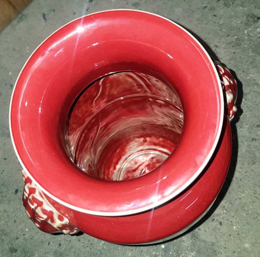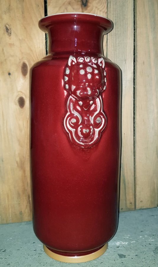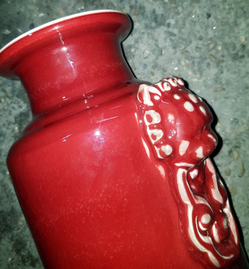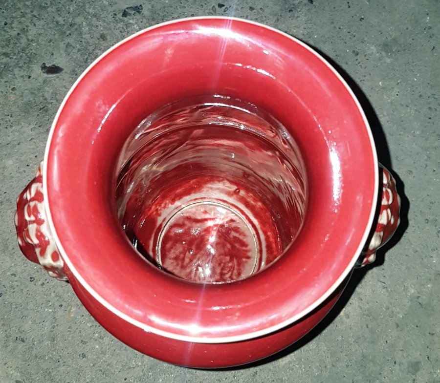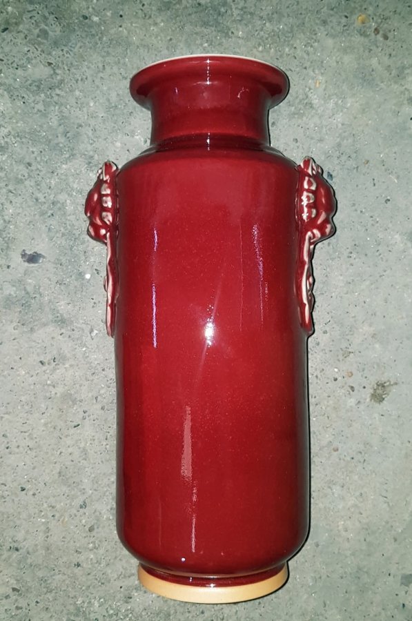 Nhất thống bình men thúy hồng với 2 H.ổ Phù 2 bên. Bình có chiều cao tổng thể 38cm. vòng bụng 50cm. miệng 12cm. Điểm đặc biệt là cả trong lòng cũng được phủ men thúy hồng. Bình lành lặn. GL2950k